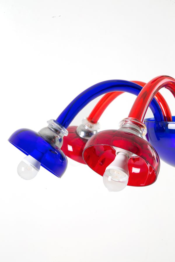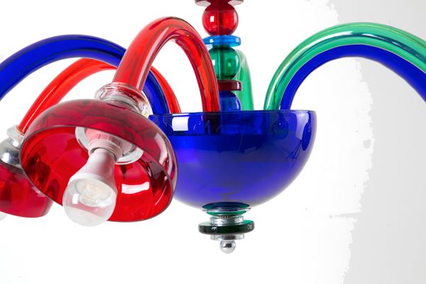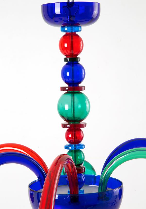 Lampadario a sei bracci in vetro colorato nei toni del blu, rosso e verde. Murano. XX secolo.