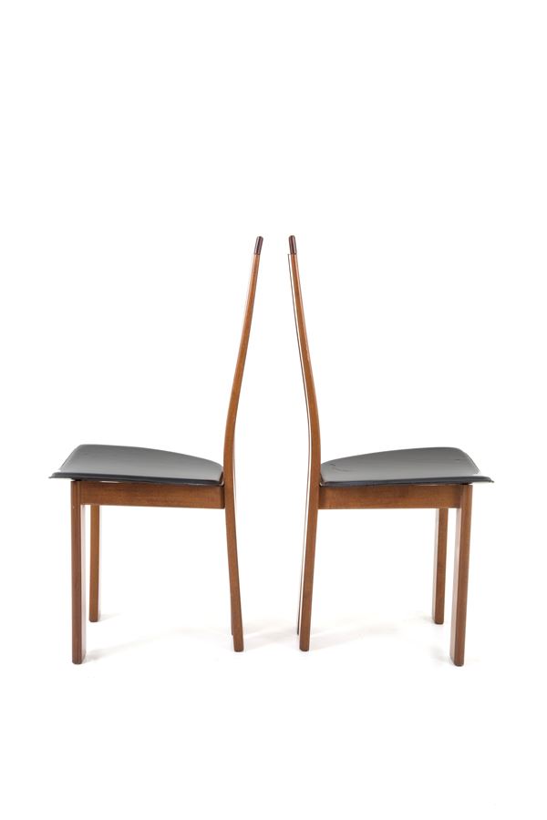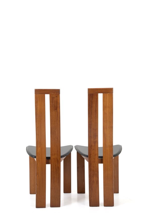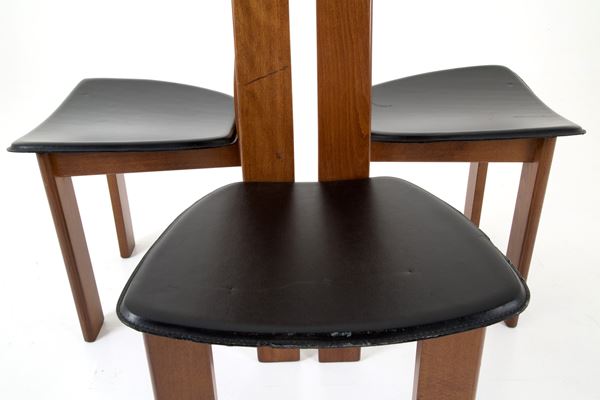 Sei sedie in legno e pelle. Produzione MOBIL GIRGI (Attr.). Anni '70. Difetti.