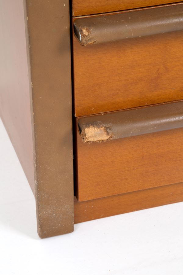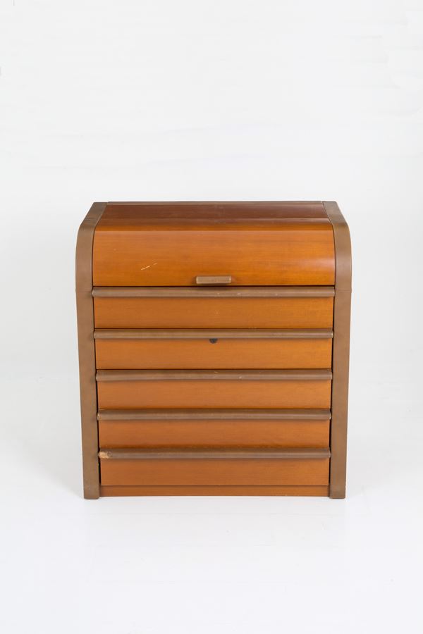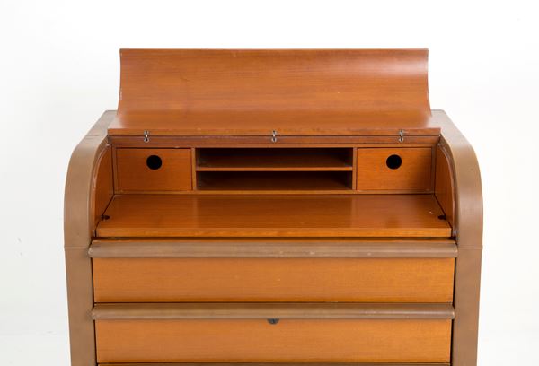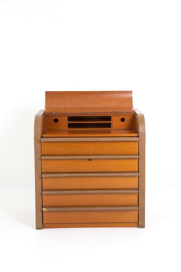 Mobile scrittoio in legno con cinque cassetti e ribalta. Produzione POLTRONA FRAU. Difetti e segni di usura del tempo. Pubblicato in G. Gramigna, Repertorio del design italiano 1950-2000 per l'arredamento domestico, vol. I, Allemandi, Torino 2003, p. 227.