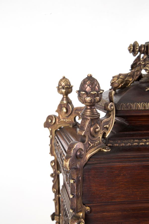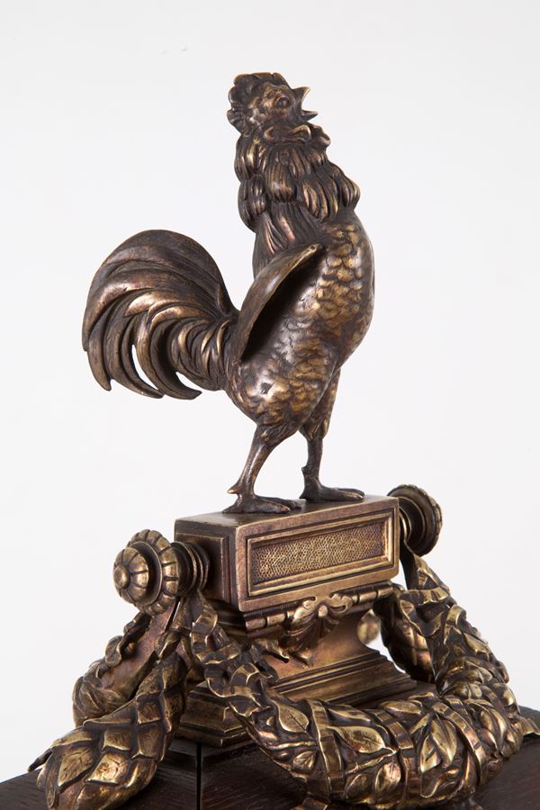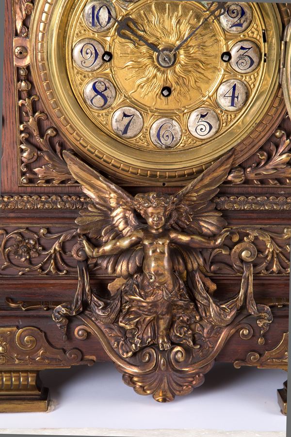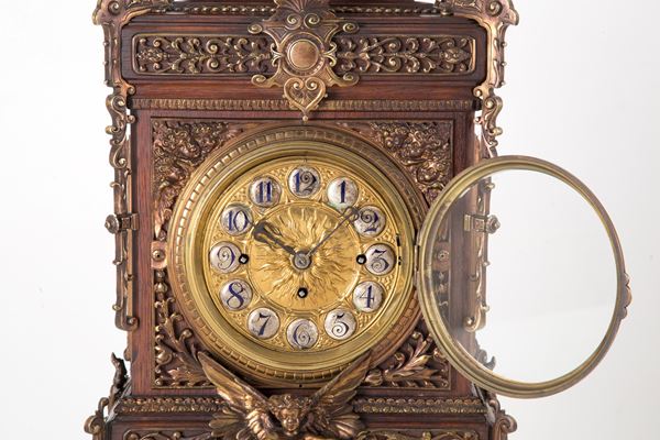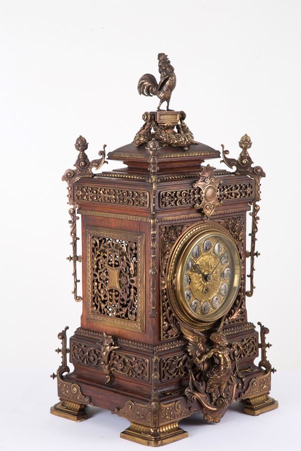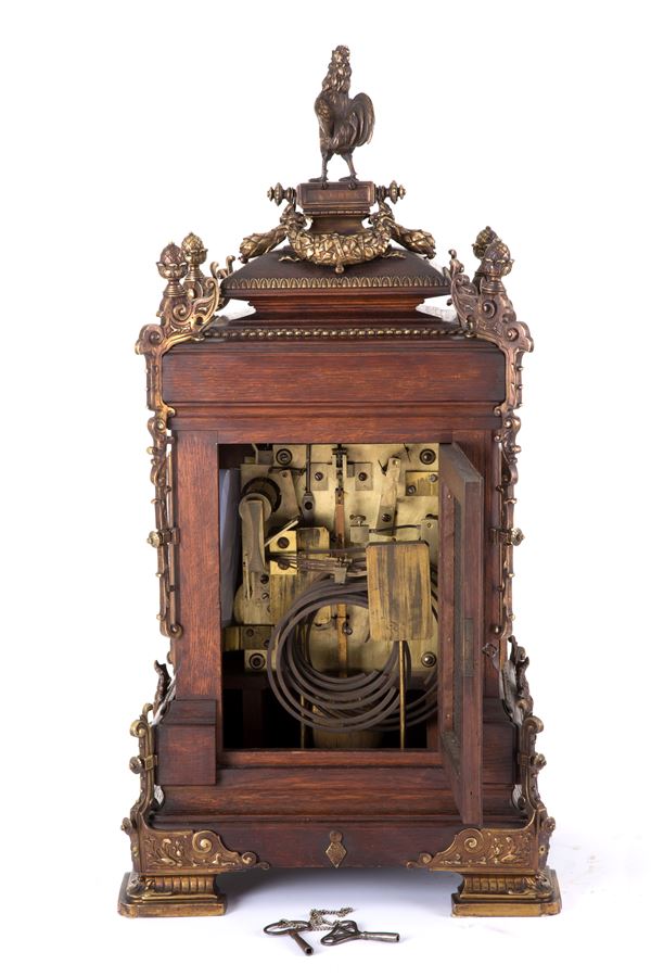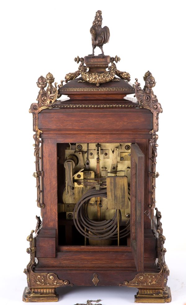 Imponente orologio da tavolo in mogano con decori in bronzo sormontato da gallo. Movimento a tre ricariche con doppia suoneria. Inghilterra. Fine XIX secolo.