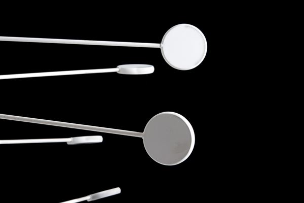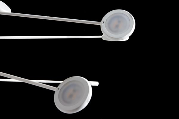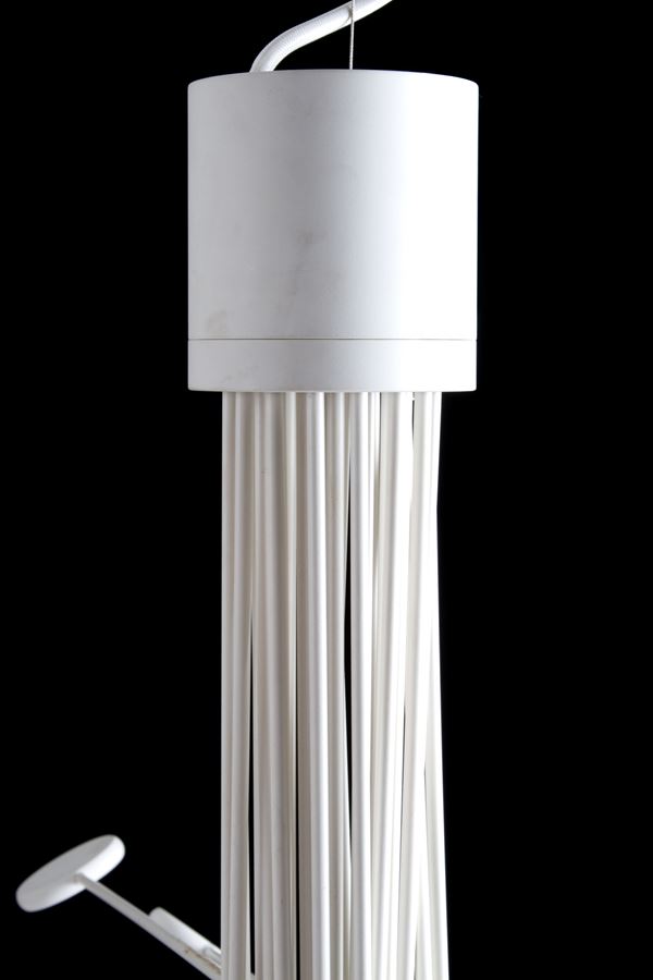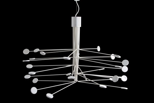 Lampadario Arbor 30s in metallo verniciato bianco con trenta bracci con dischetti orientabili. Produzione ICONE LUCE. Segni di usura del tempo.
