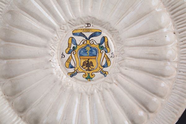 Piatto compendiario in maiolica a fondo bianco con stemma nobiliare nei toni del blu, giallo e verde con aquila e iniziali. Faenza. XVI secolo. Difetti e rotture.