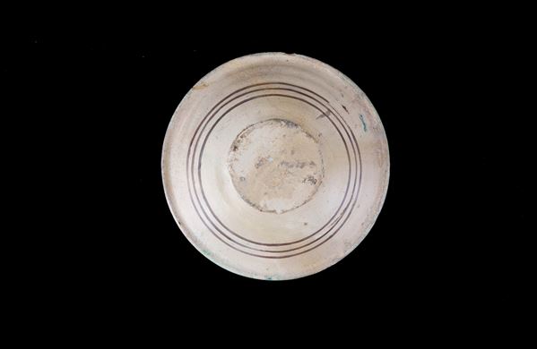 Piatto in maiolica policroma con soldato al centro. Montelupo. XVIII secolo. Lievi difetti.
