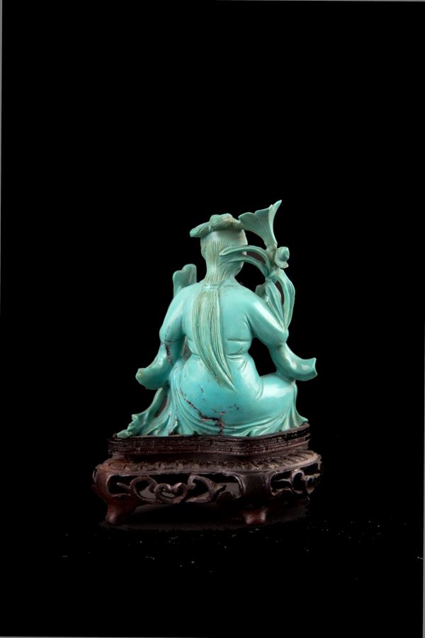 Piccola scultura in turchese raffigurante "GUANYIN CON FIORE DI LOTO". Base in legno traforato. Inizi XIX secolo.
