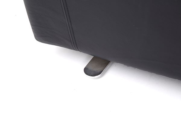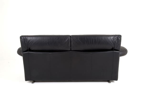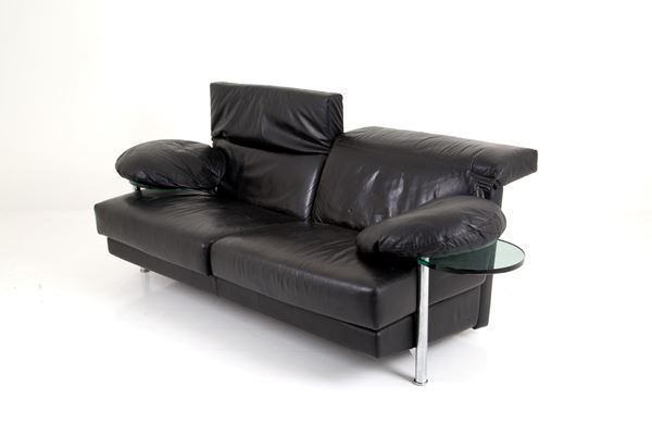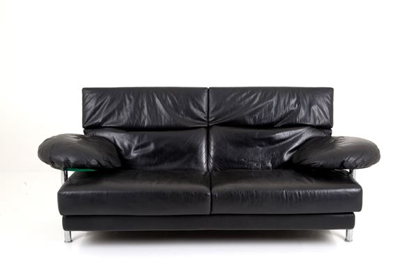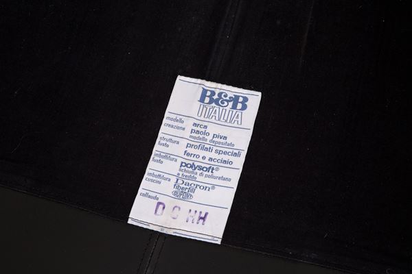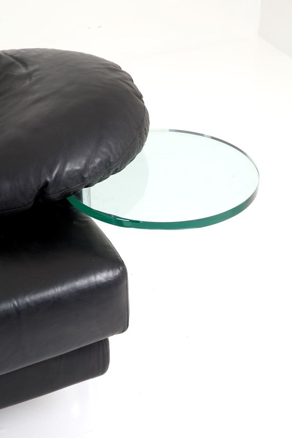 Divano modello Arca due posti in ferro, acciaio e pelle nera con tavolini girevoli in vetro. Produzione B&B Italia. Con etichetta del produttore. Anni '80. Difetti e segni di usura del tempo.