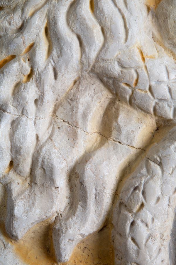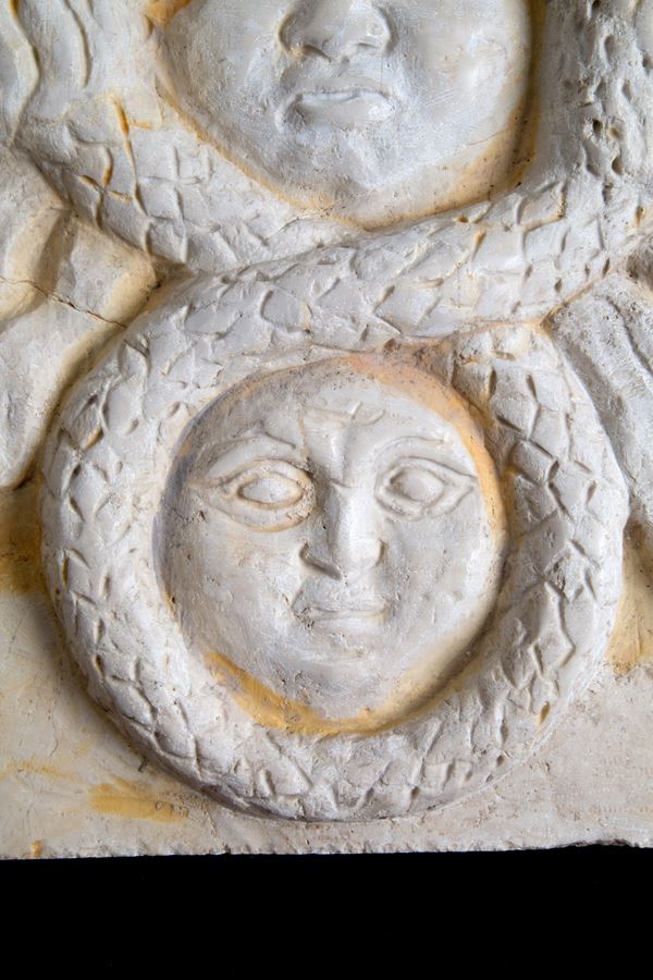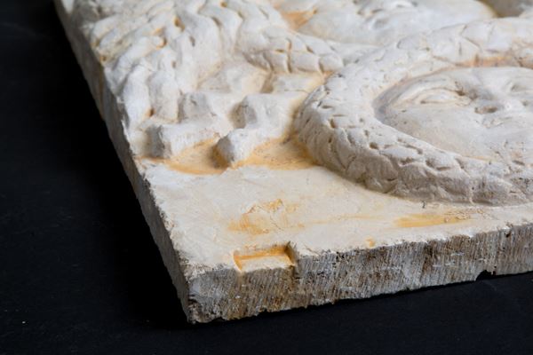 Placca in agglomerato di pietra raffigurante "FIGURE MITOLOGICHE". XX secolo. Segni di usura del tempo.