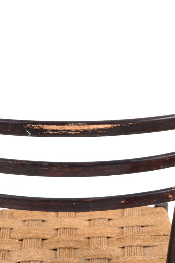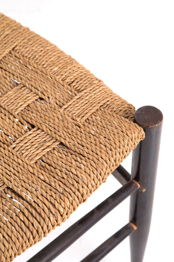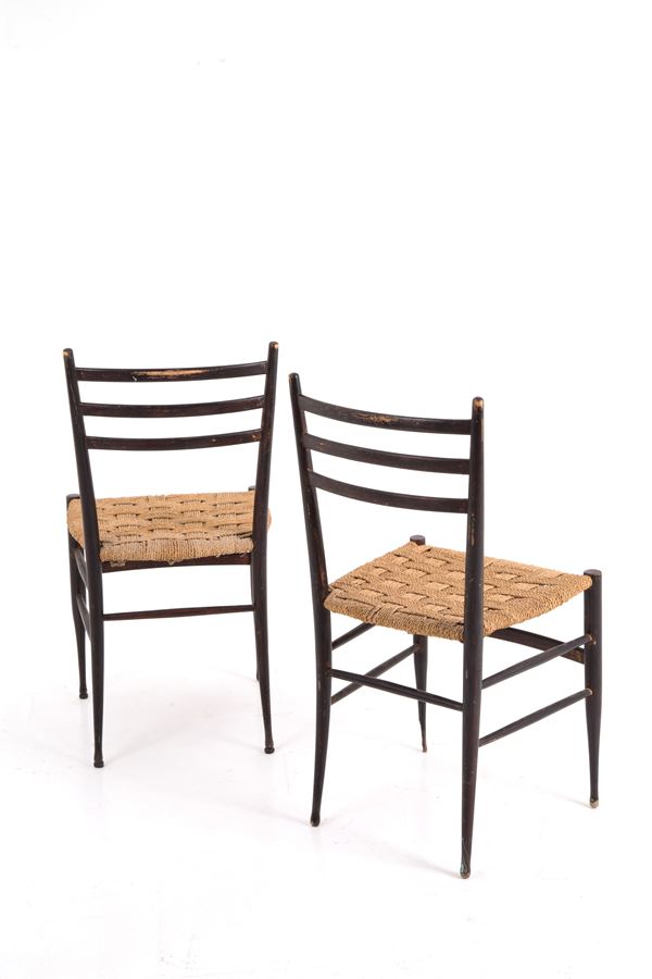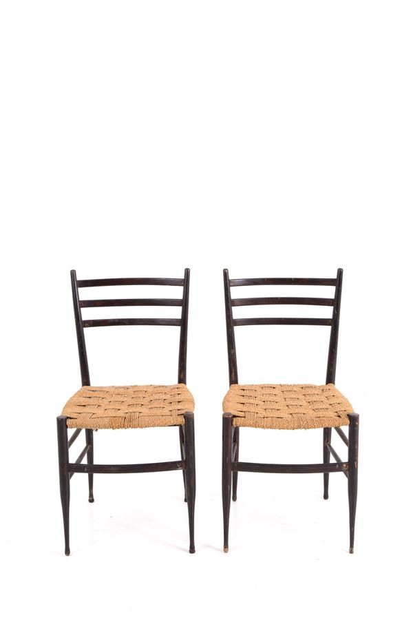 Due sedie in legno tinto con seduta in spago. Anni '50. Difetti e segni di usura del tempo.