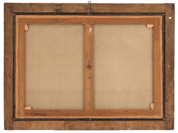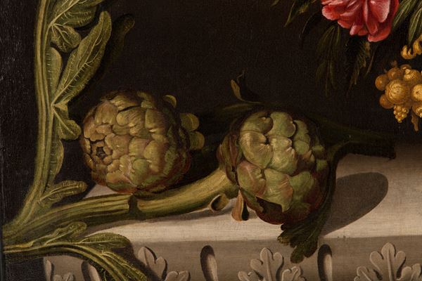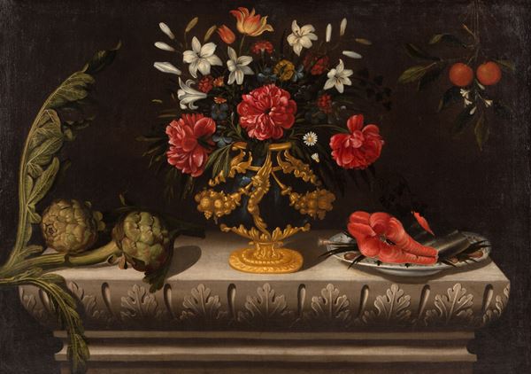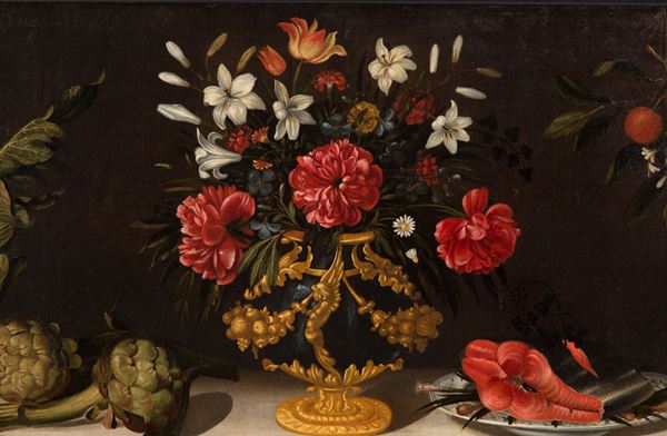 Dipinto olio su tela raffigurante "NATURA MORTA CON VASO DI FIORI, CARCIOFI, UN PIATTO DI SALMONE E ARANCE". In cornice laccata e dorata. Già rintelato e rintelaiato. Lievissimi restauri.