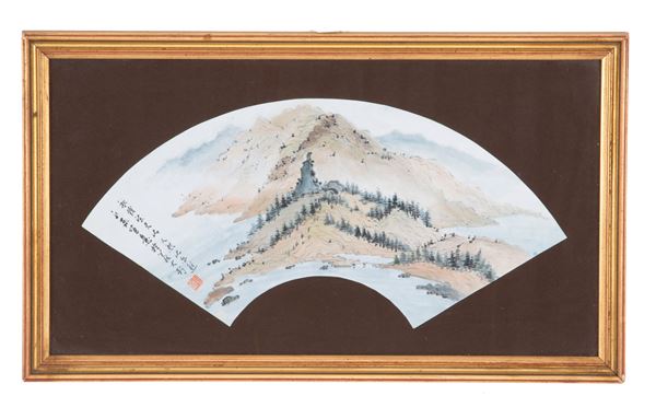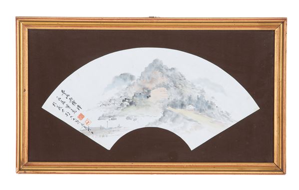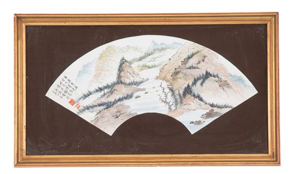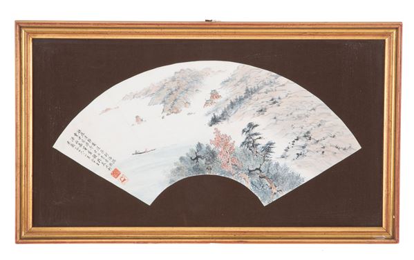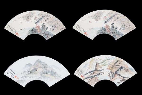 Quattro fogli di carta a forma di ventaglio raffiguranti "PAESAGGI E ANIMALI" con scritte e sigilli rossi. Cina. In cornici dorate.