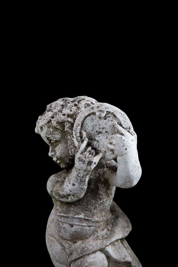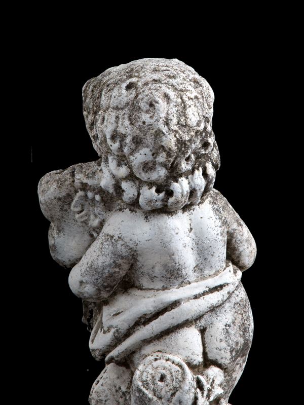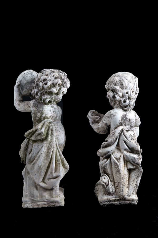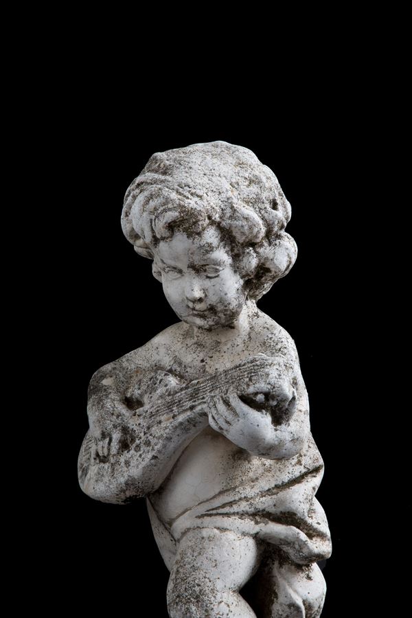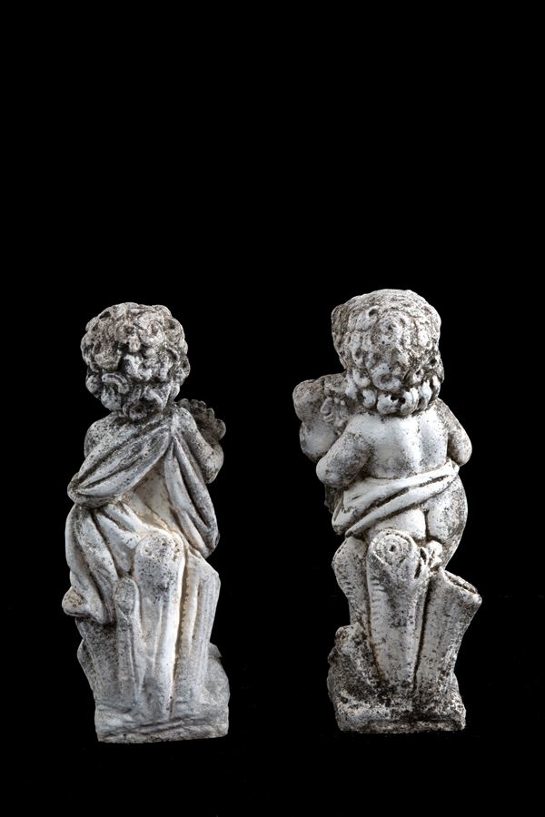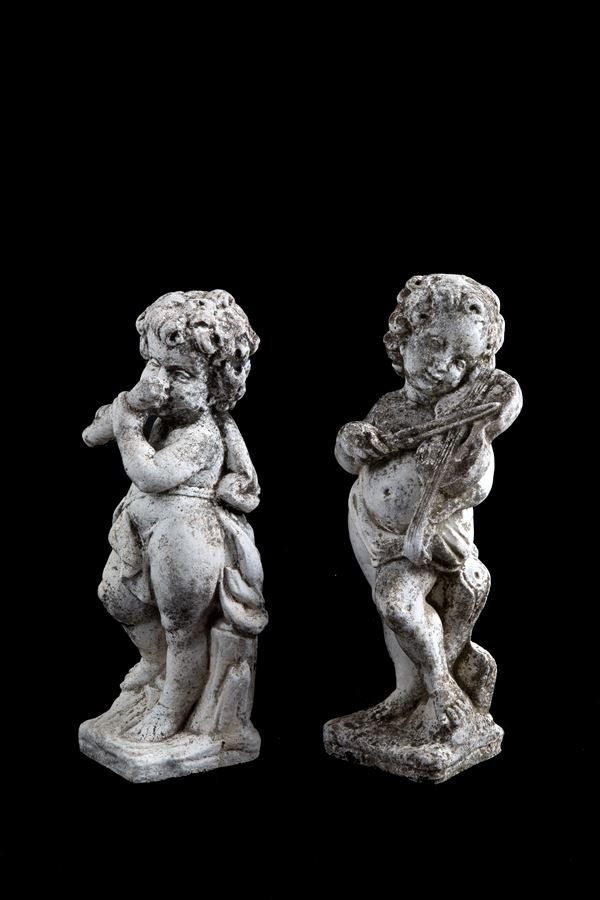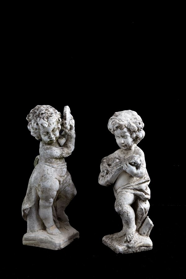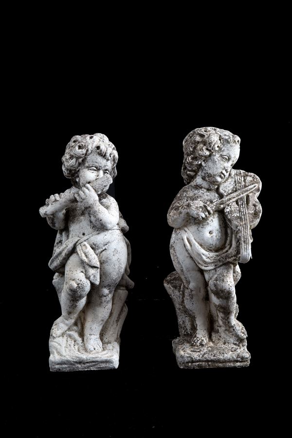 Quattro sculture in agglomerato di pietra raffiguranti "PUTTI MUSICANTI". XX secolo. Segni di usura del tempo.