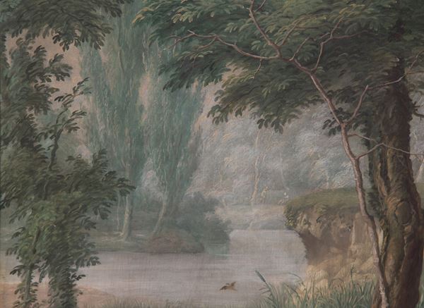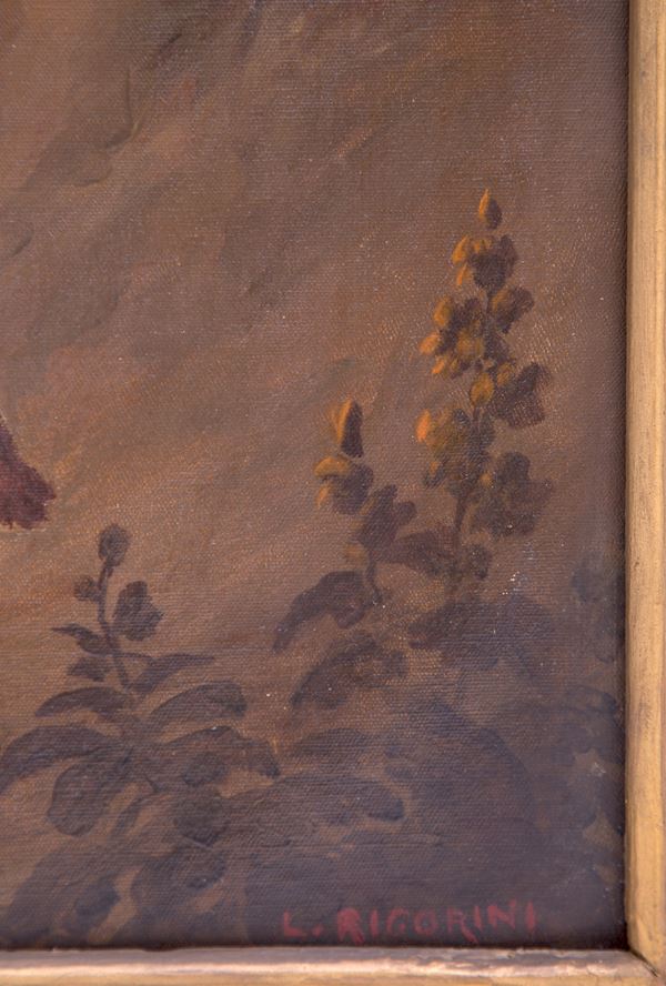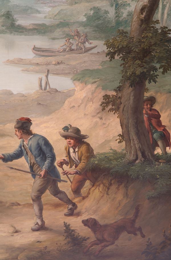 Trittico olio su tela raffigurante "PAESAGGIO CON SCENA DI CACCIA ALLA LEPRE". Firmato in basso a destra sul dipinto centrale. In cornici. Difetti.