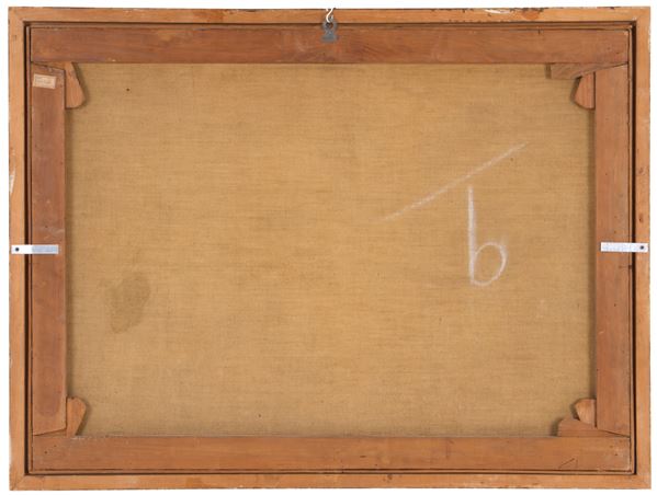 Dipinto olio su tela raffigurante "PASTORI A RIPOSO CON ARMENTI". In cornice. Difetti. Già rintelato e rintelaiato.