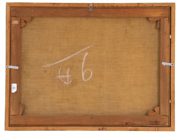 Dipinto olio su tela raffigurante "PASTORELLO CON CONTADINA E ARMENTI". In cornice. Difetti. Già rintelato e rintelaiato.