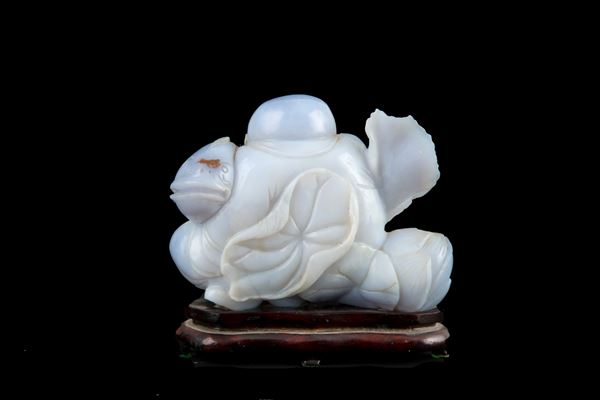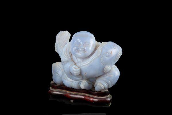 Scultura in agata azzurra raffigurante "MONACO". Base in legno. Cina. Piccoli difetti.