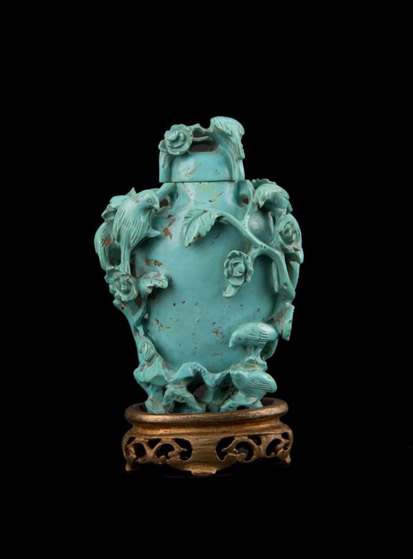 Snuff bottle in turchese. Base in legno traforato. XIX secolo. Lievi difetti.