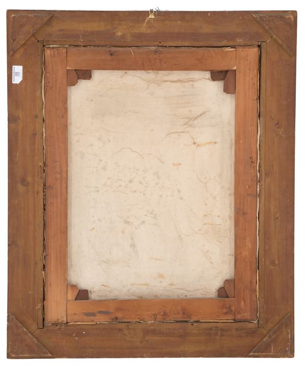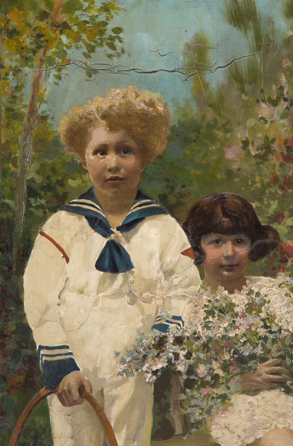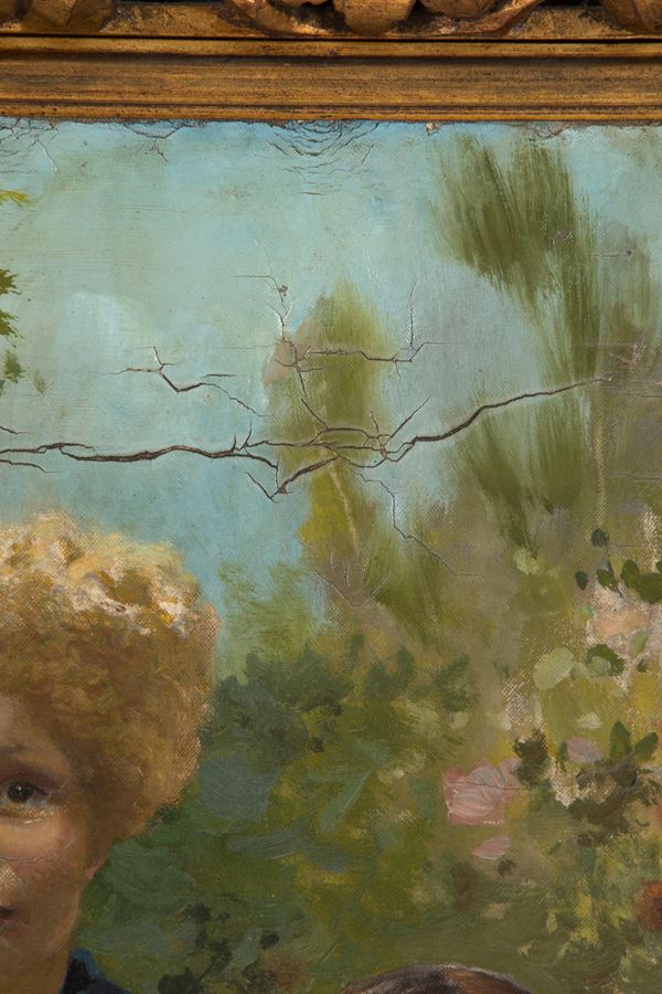 Dipinto olio su tela raffigurante "BAMBINI IN GIARDINO". Firmato in basso a destra. In cornice in legno intagliato e dorato. Difetti. Già rintelato.