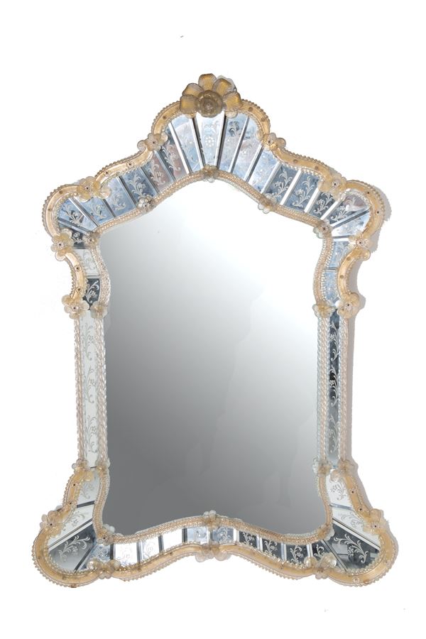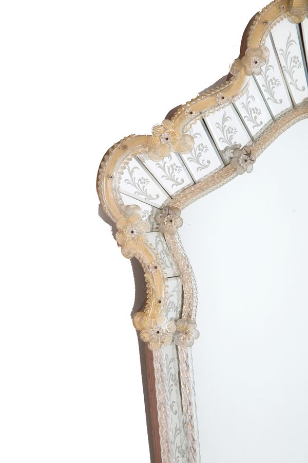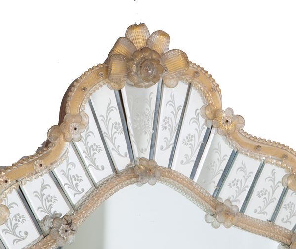 Specchiera in legno rivestita in vetro di Murano con placche in vetro molato. XX secolo. Segni di usura del tempo.