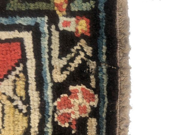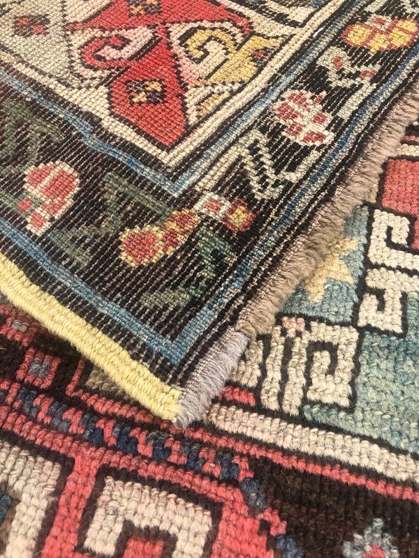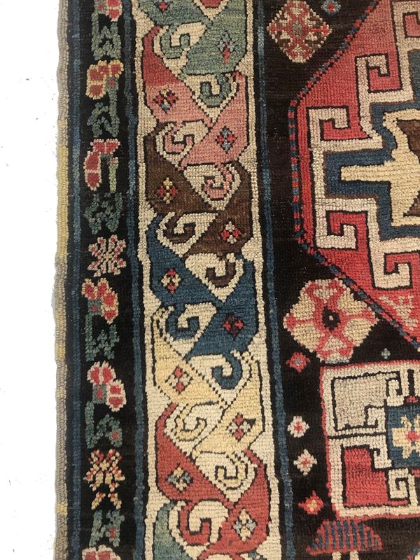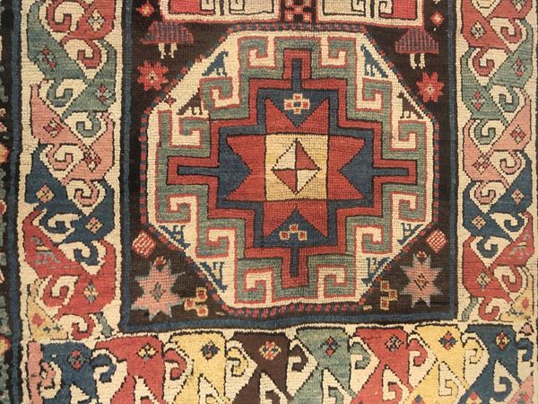 Tappeto Ghendjè disegno a medaglioni uncinati e bordura pappagallo. Caucaso. Fine XIX secolo. Buono stato di conservazione, senza restauri.