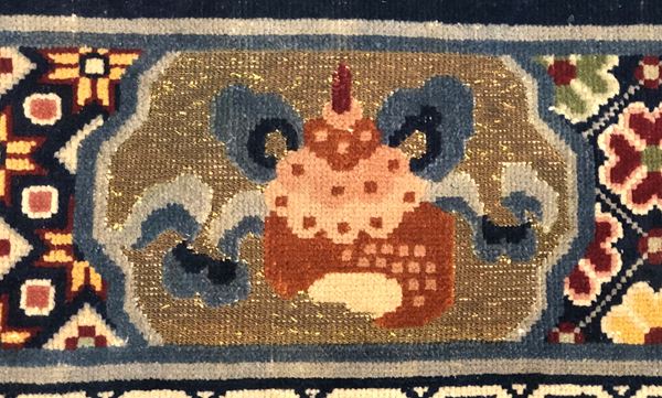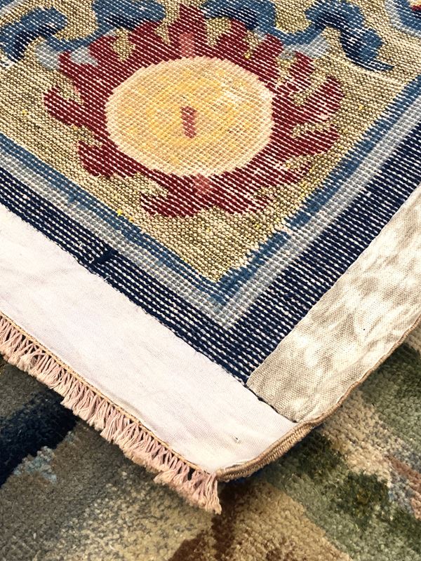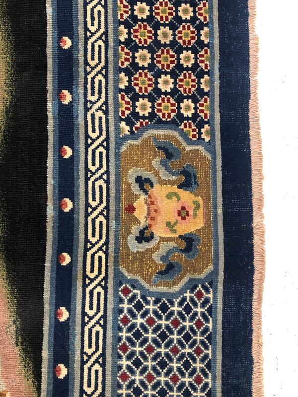 Tappeto Pekino lavorazione in lana con fili dorati. Cina. Seconda metà del XIX secolo. Eccellente stato di conservazione, quattro lati originali.