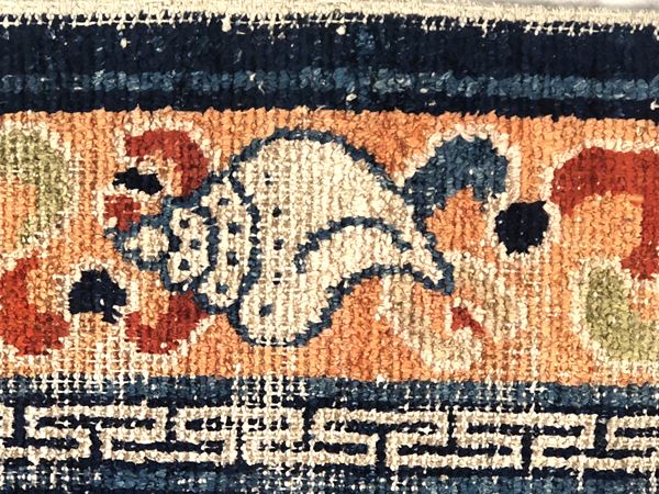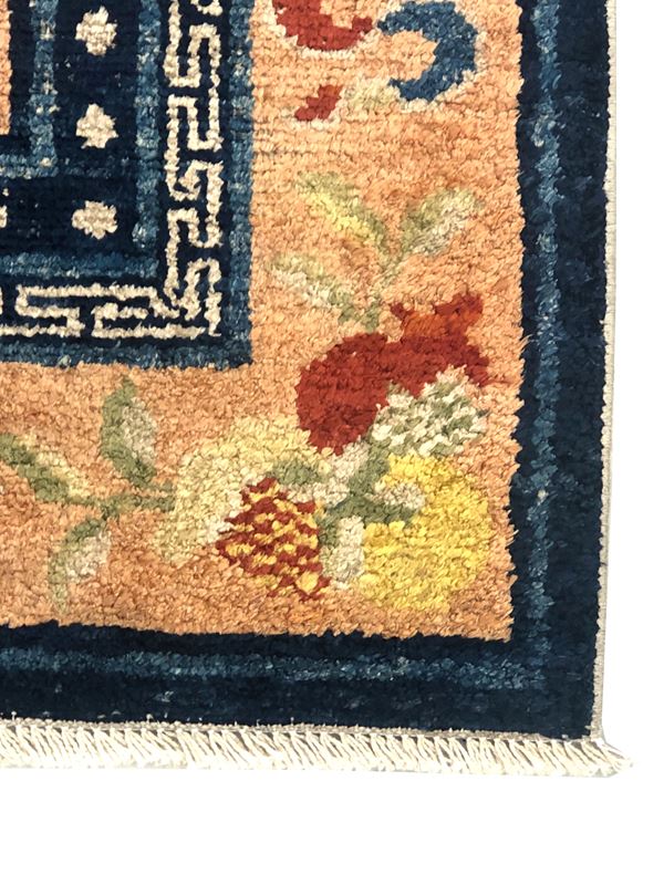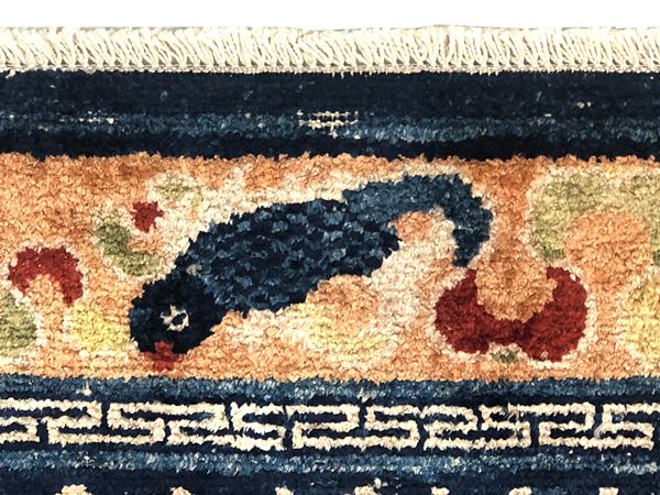 Tappeto Pekino in seta. Cina. Circa 1900. Quattro lati perimetrali originali, aree consumate sul campo.