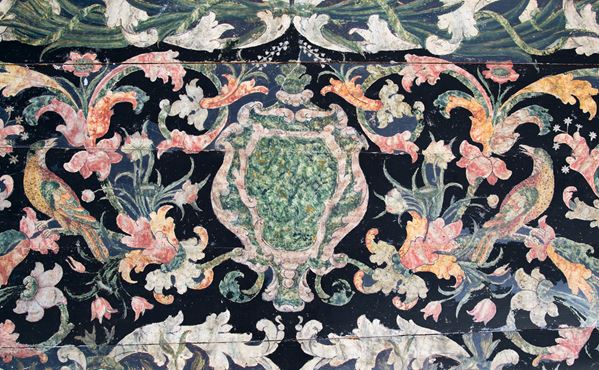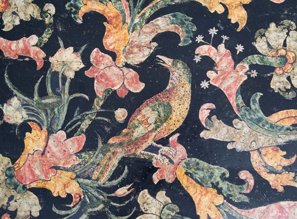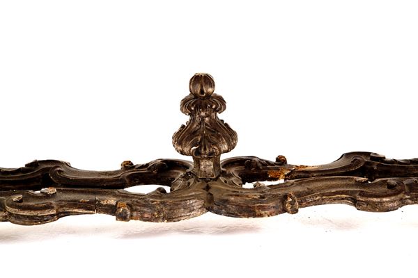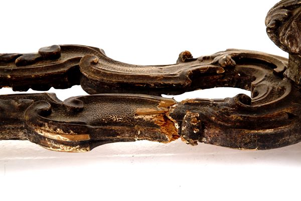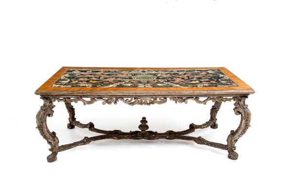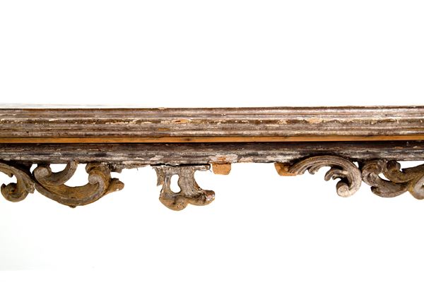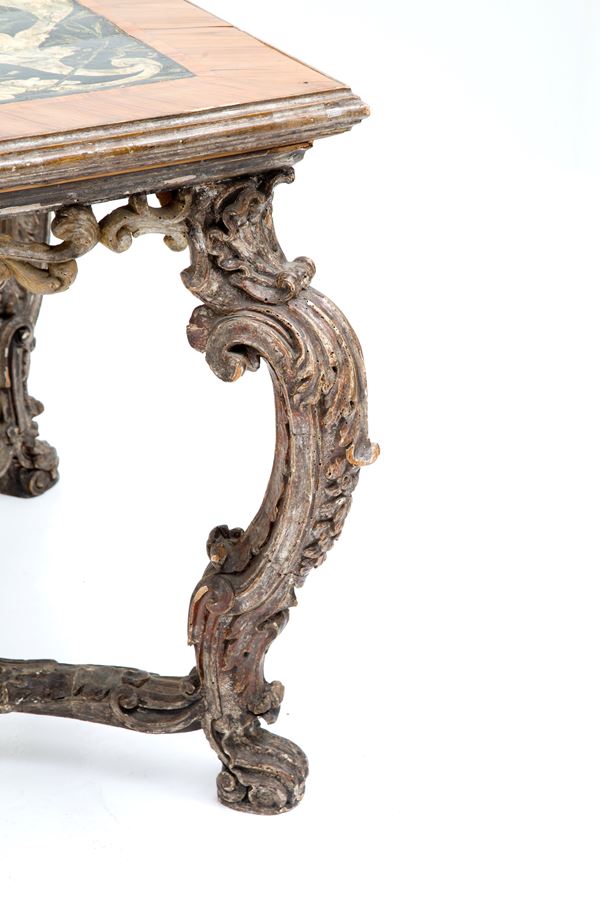 Tavolo in legno intagliato e dorato a mecca con piano dipinto a finta scagliola. Fine XVIII-inizi XIX secolo. Difetti e mancanze.