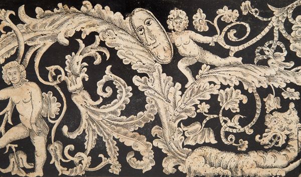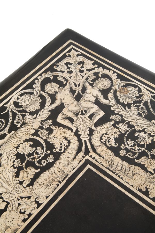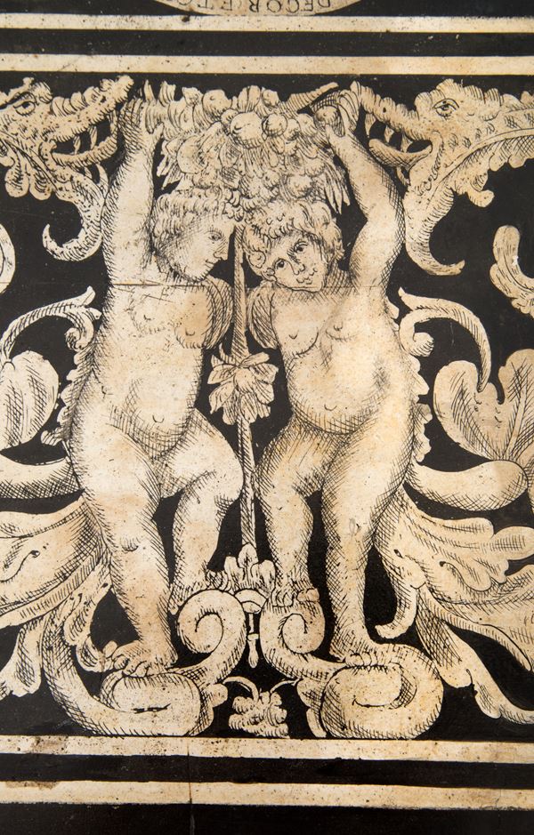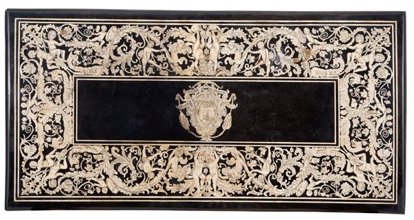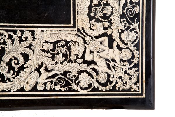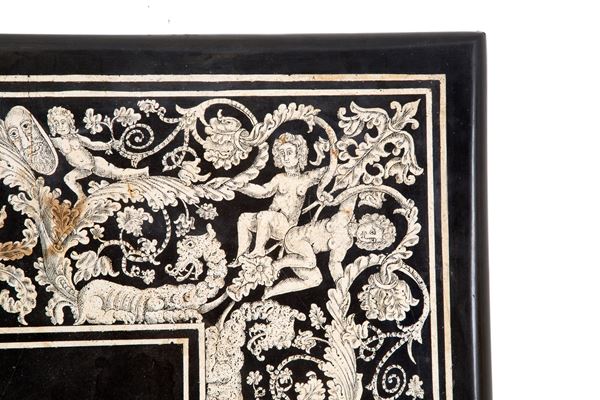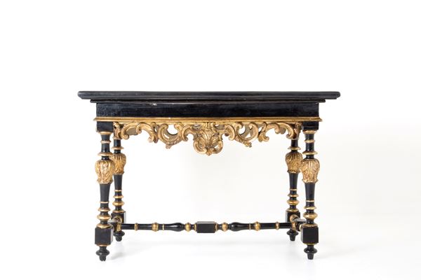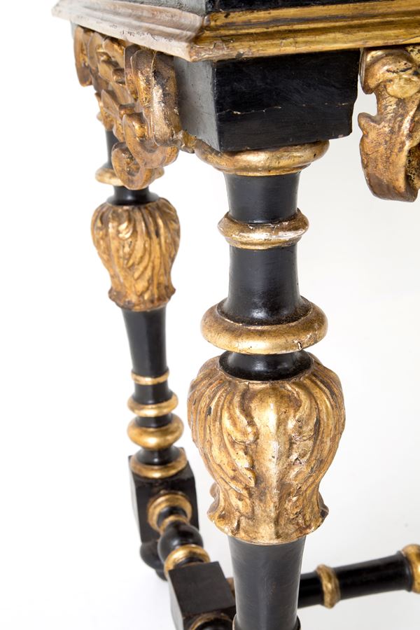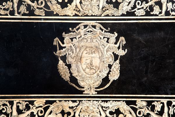 Tavolo da parata in legno intagliato, tornito, laccato e dorato con piano in ardesia e scagliola pirografata con stemma nobiliare della famiglia Curini Galletti inquadrato da girali con putti. Fine XVII secolo.