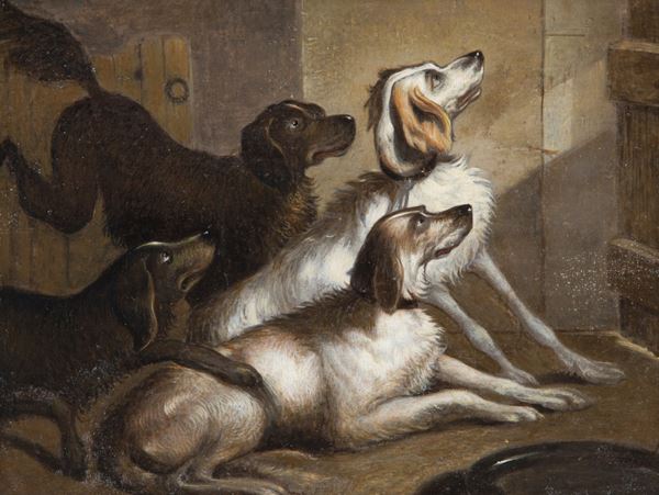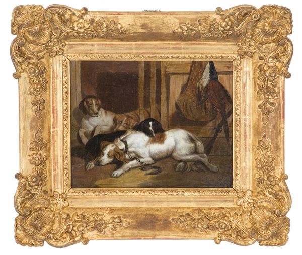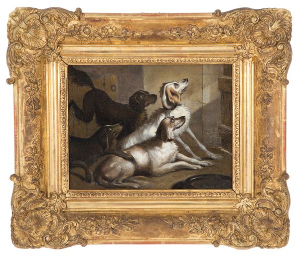 Coppia di dipinti raffiguranti "CANI". Con cartiglio sul retro. In cornice dorata.