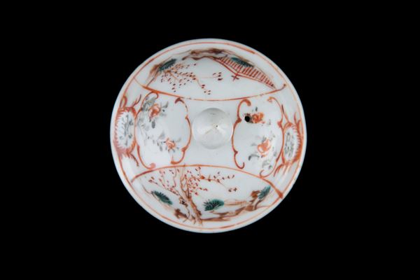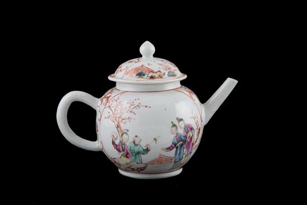 Teiera in porcellana Famiglia Rosa dipinta con scene di vita orientali. Cina. Periodo Qianlong.