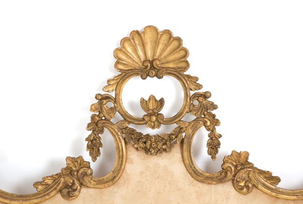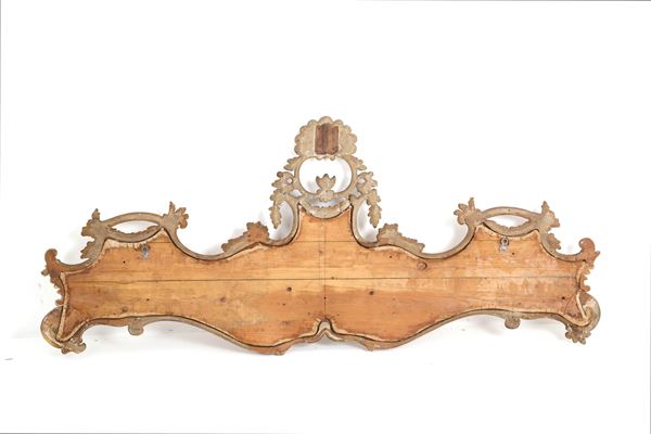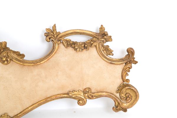 Testata da letto in legno finemente intagliato e dorato a mecca con imbottitura. XVIII secolo.