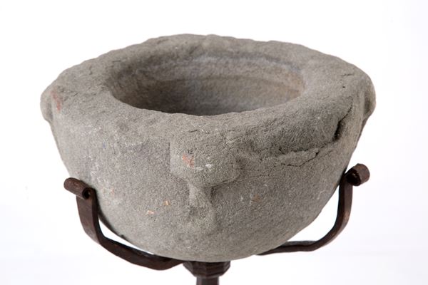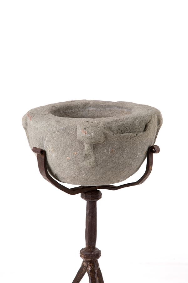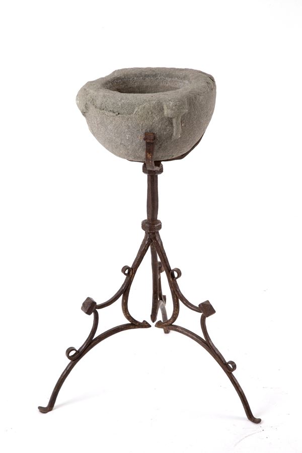Trespolo in ferro battuto con vasca in pietra. XVII secolo. Lievi difetti.