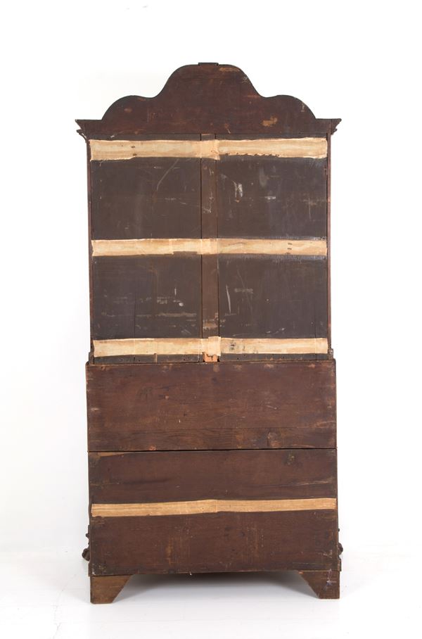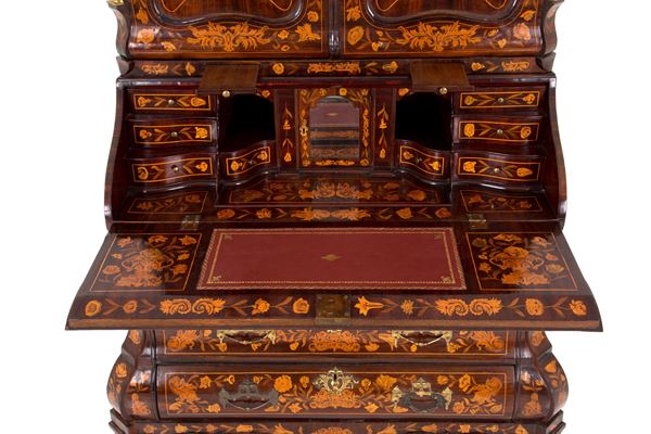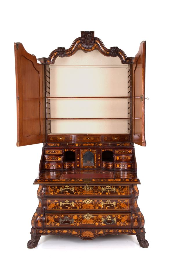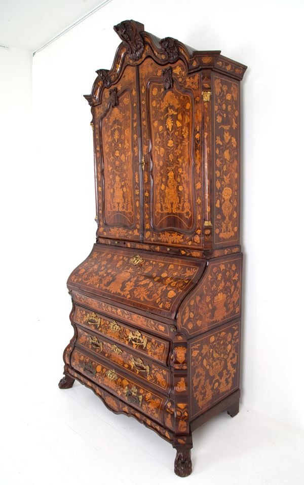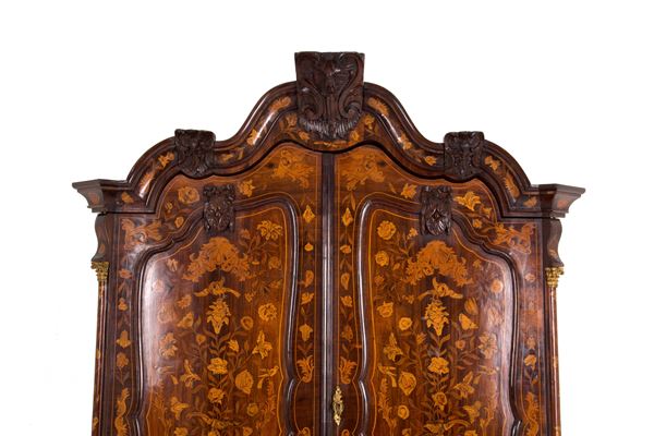 Trumeau intarsiato in legni vari a motivi floreali con vasi, putti, mascheroni e animali con guarnizioni in bronzo dorato. Olanda. Fine XVII-inizi XVIII secolo. Lievi difetti e mancanze.