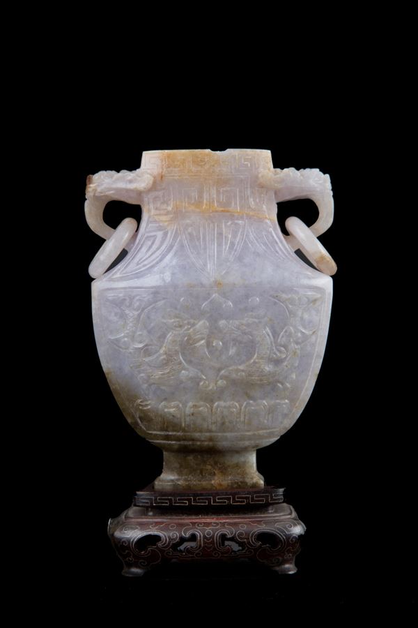 Vaso in giada color lavanda con coperchio. Base in legno. Cina. XIX secolo. Lievi difetti.