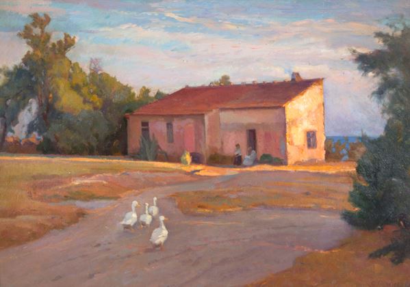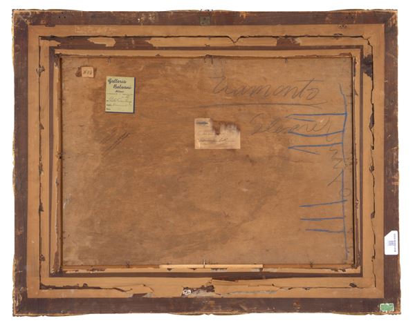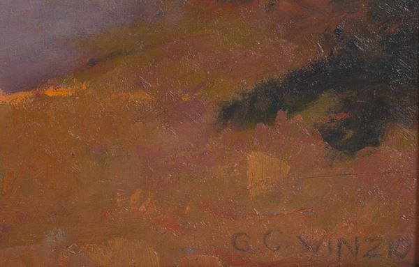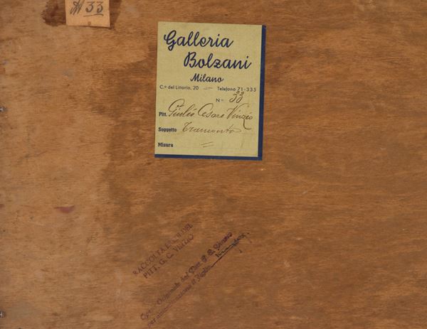 Dipinto olio su tavoletta raffigurante "CASOLARE CON OCHE". Intitolato "TRAMONTO" sul retro. Firmato in basso a destra. Controfirmato sul retro. Con cartiglio della galleria Balzani, Milano, timbro della raccolta eredi del pitt. G. C. Vinzio e timbro di conferma di autenticità del figlio dell'artista sul retro. Esposto alla mostra commemorativa tenutasi alla Galleria Dedalo, Milano, nel febbraio 1941. In cornice in legno dorato.