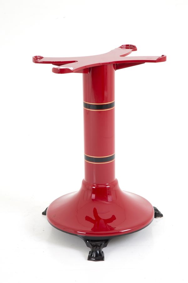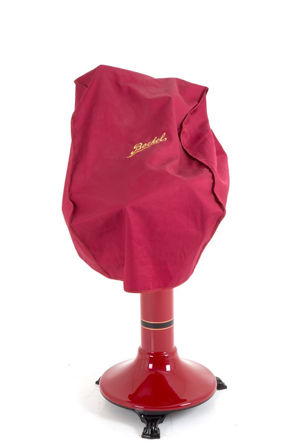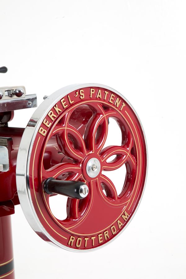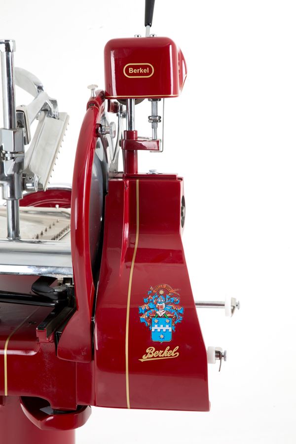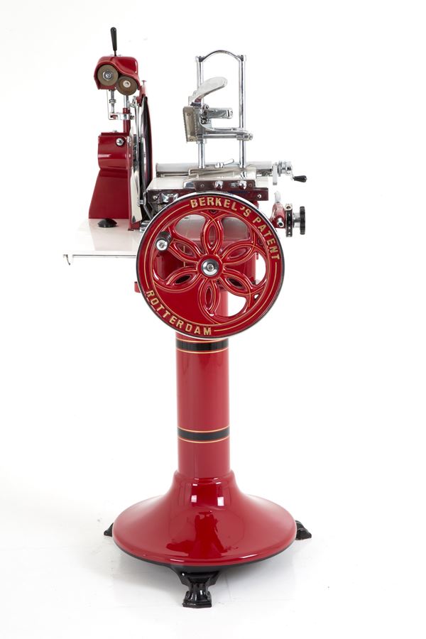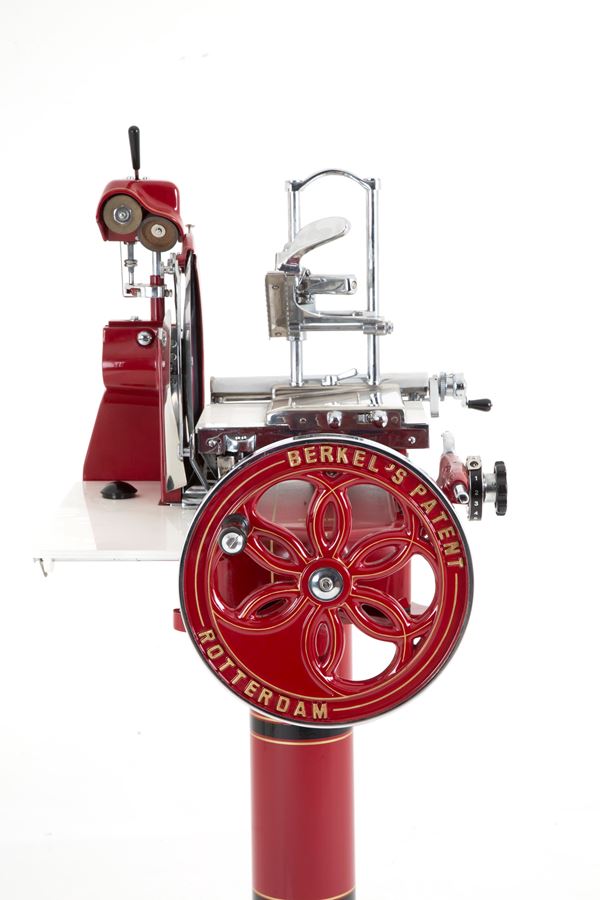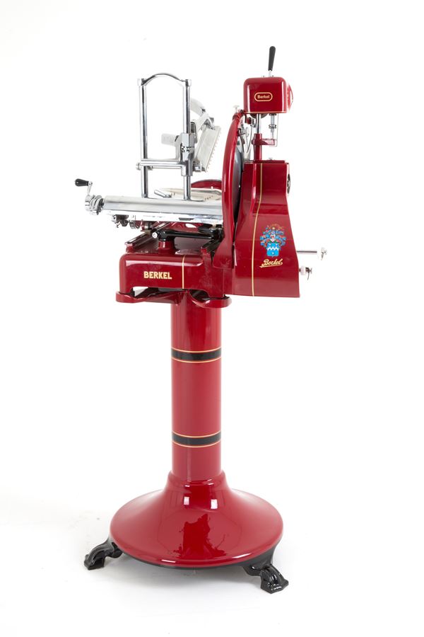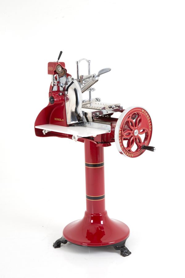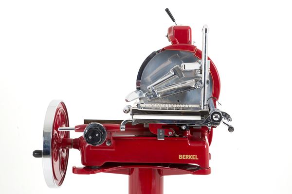 Affettatrice a volano rossa con piedistallo. Lama in acciaio cromato diam. 32 cm ca. BERKEL. Con fodera originale. Lievi segni di usura del tempo.