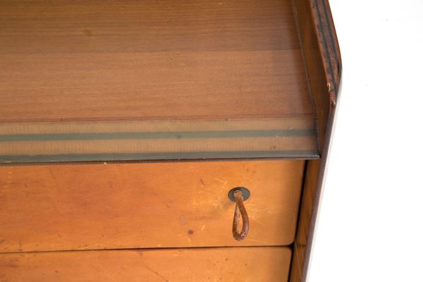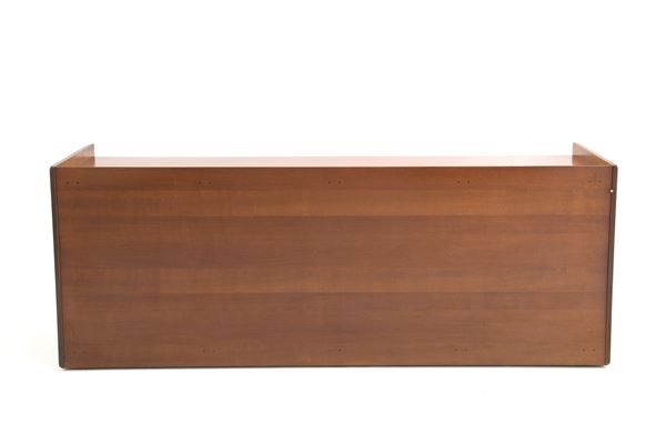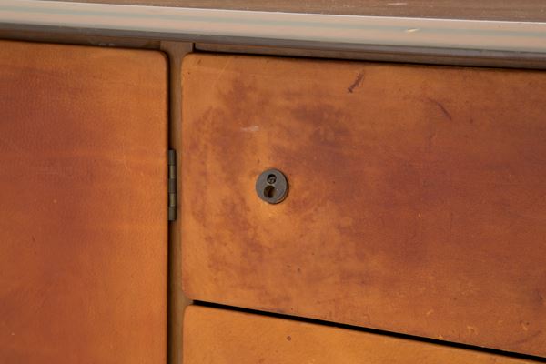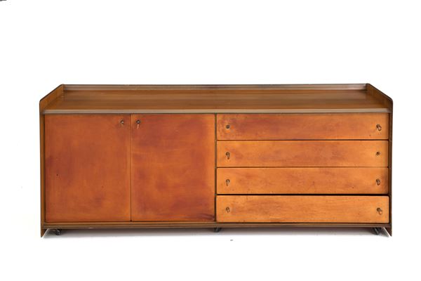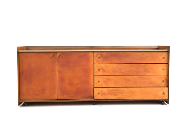 Credenza serie Artona in legni vari con quattro cassetti e due ante sul fronte in cuoio. Produzione MAXALTO. Anni '70. Difetti e mancanze.