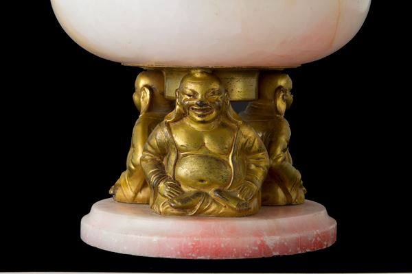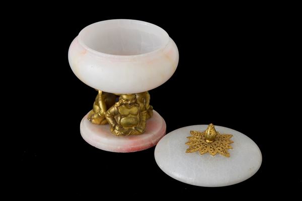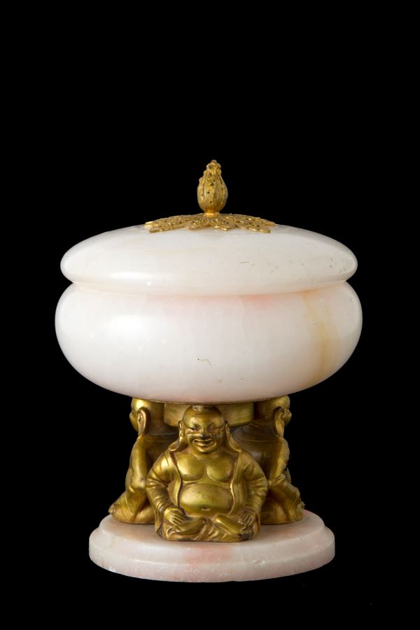 Alzatina con coperchio in alabastro e bronzo dorato con supporti raffiguranti "BUDDHA SEDUTO". XIX secolo.