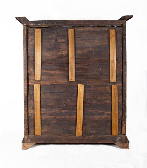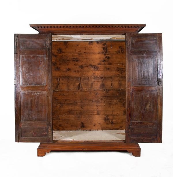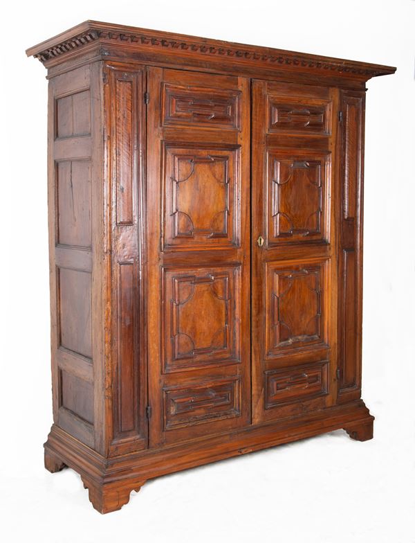Armadio in noce a due ante pannellate. Italia settentrionale. Fine XVII secolo. Lievi difetti e restauri.