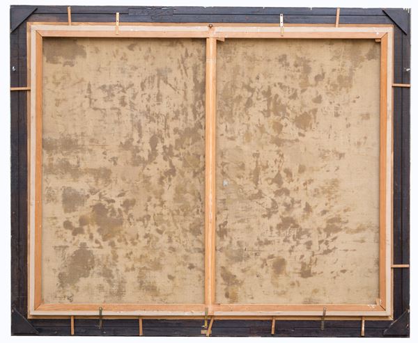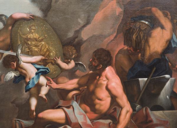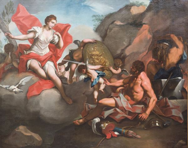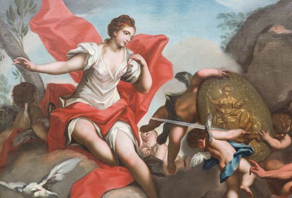 Dipinto olio su tela raffigurante "VENERE CHIEDE A MARTE DI FORGIARE LE ARMI PER ENEA". In cornice. Già rintelato e rintelaiato. Restauri.