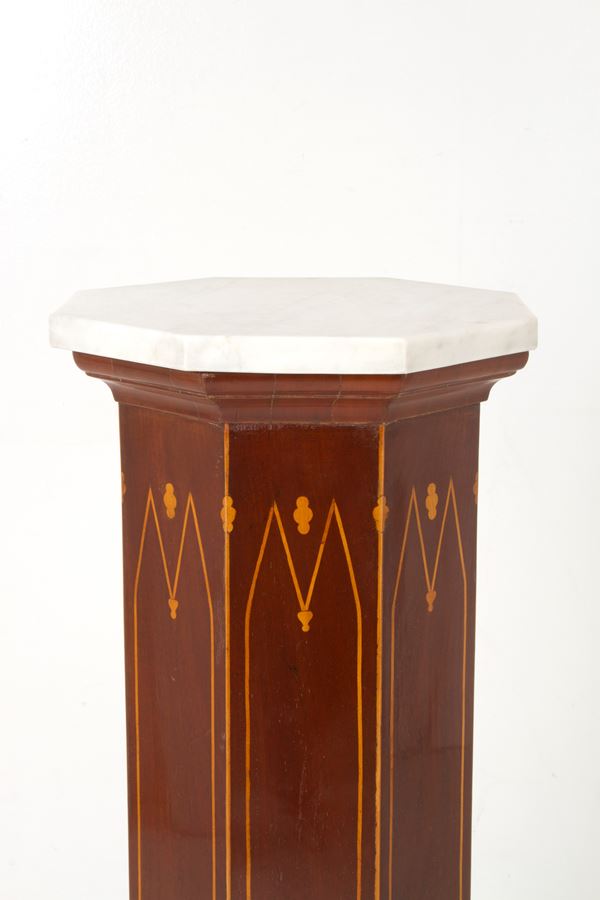 Colonna ottagonale in legno intarsiato a motivi geometrici con piano in marmo bianco. Periodo Carlo X. Lievi difetti.