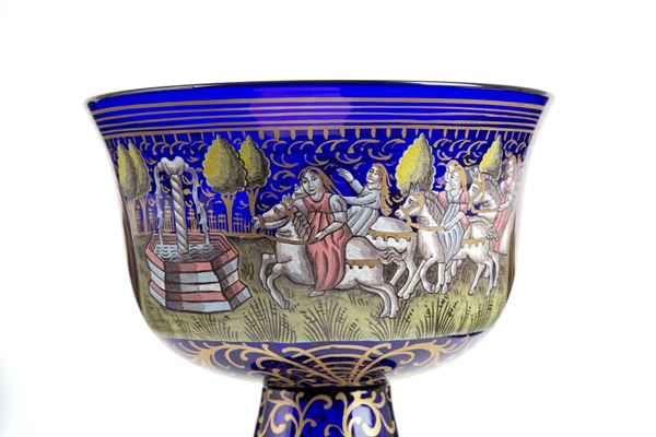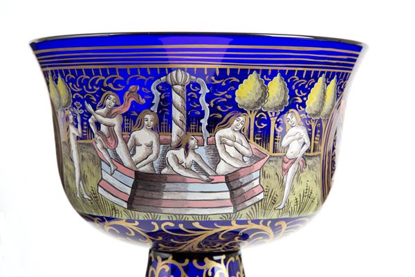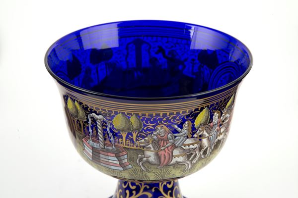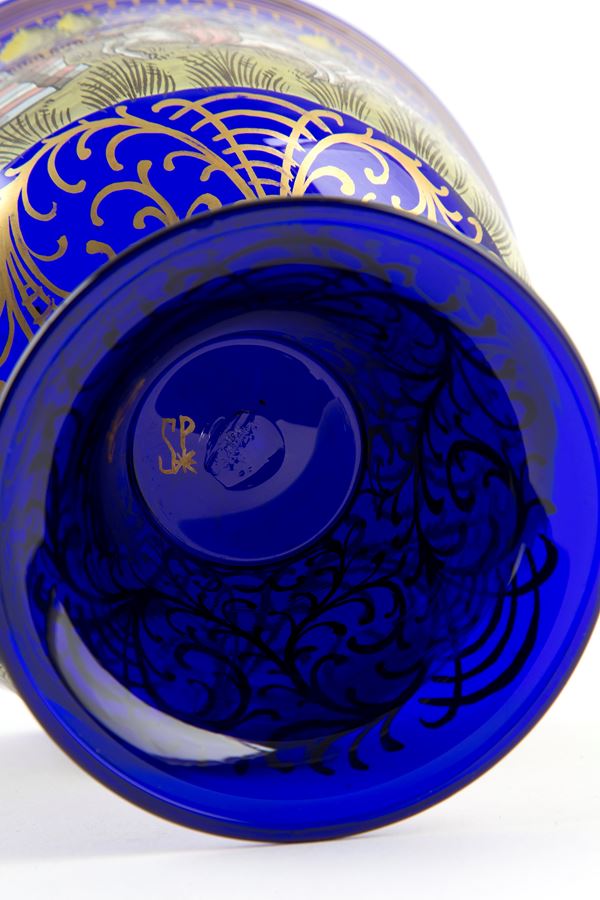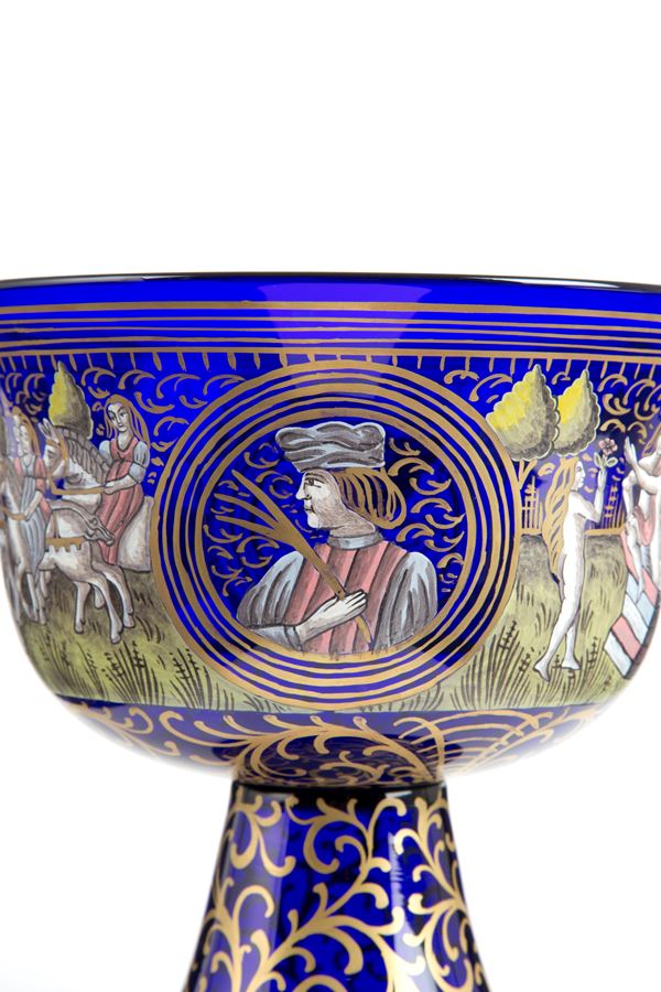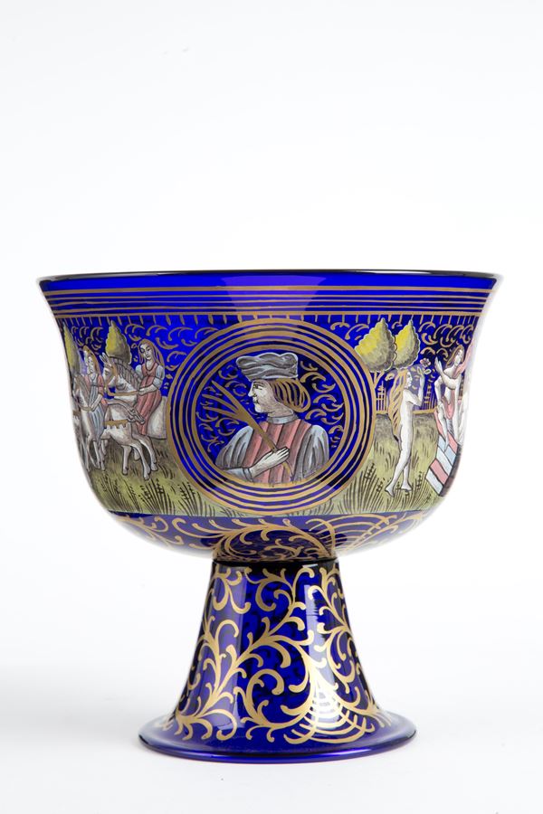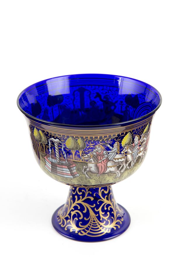 Coppa in cristallo blu cobalto decorato con personaggi. Marcata SP sul fondo. XX secolo.