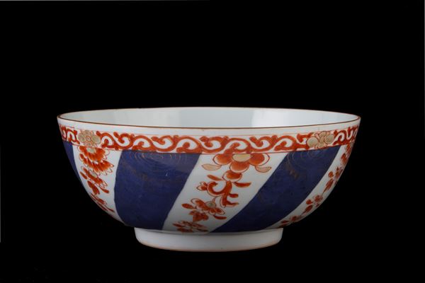 Coppa in porcellana Imari nei toni del blu, bianco e rosso con lumeggiature in oro. Cina.