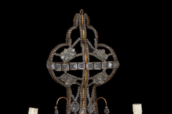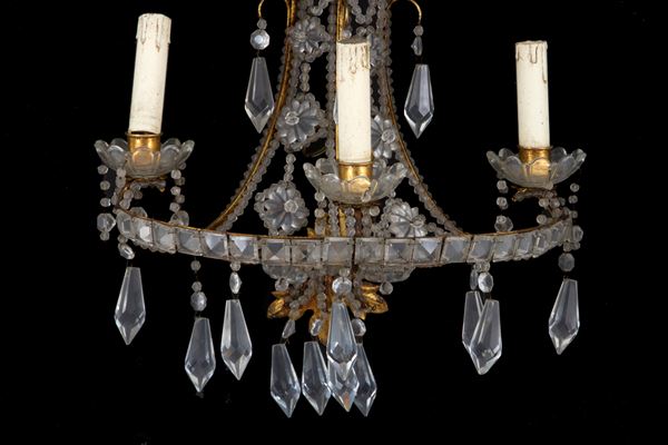 Coppia di applique tre luci in ferro dorato e perline in vetro. XX secolo. Lievi difetti.
