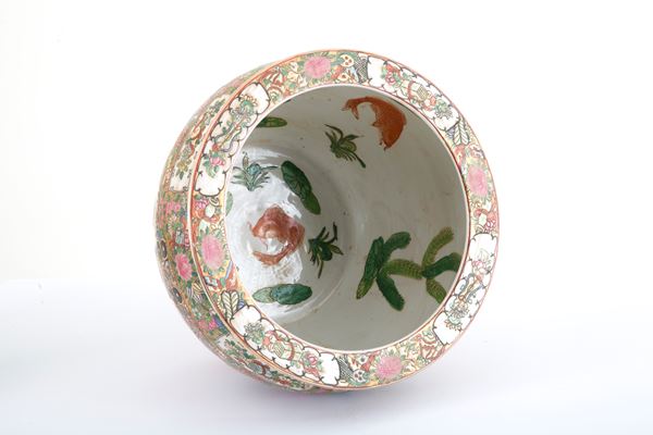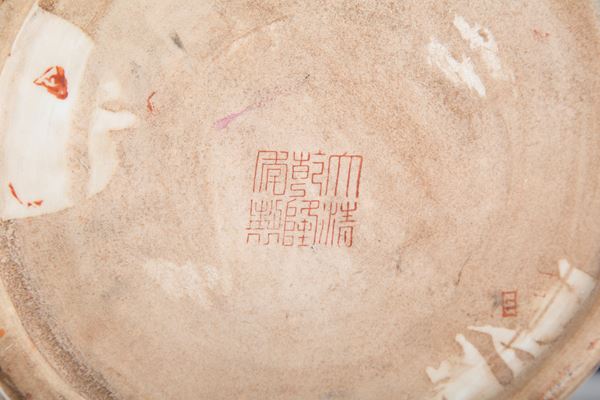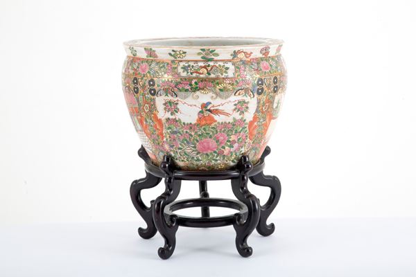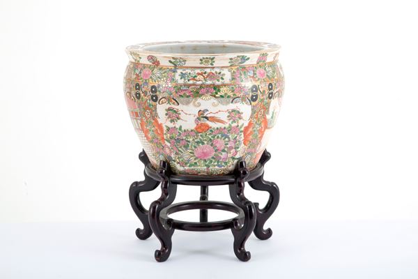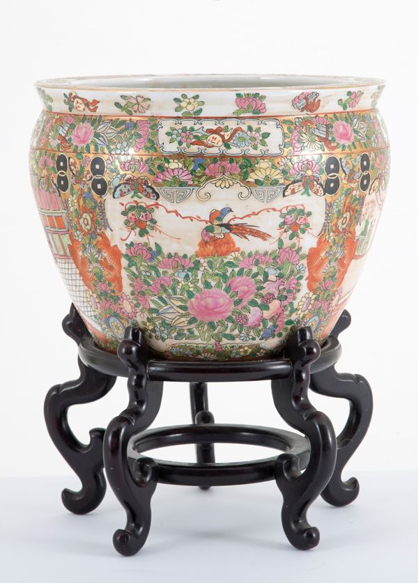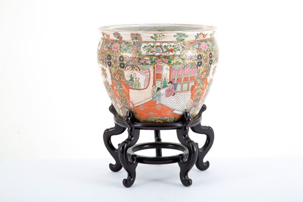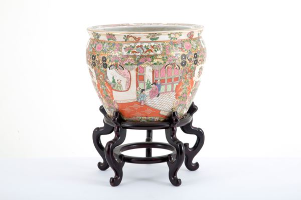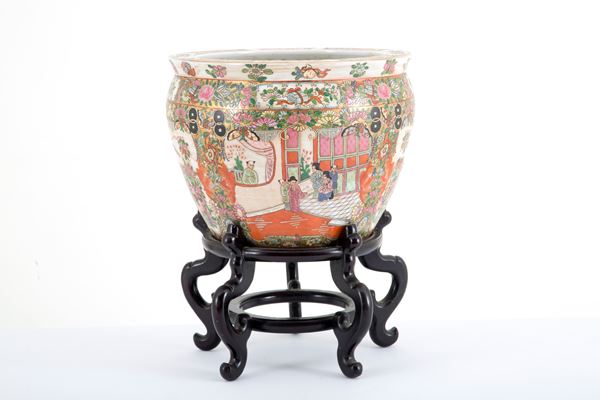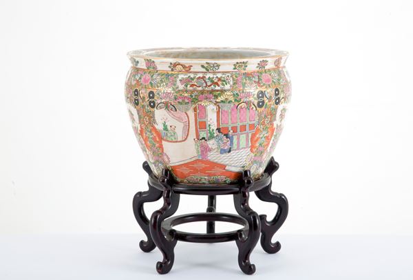 Coppia di cachepot in ceramica policroma raffiguranti "SCENE DI VITA ORIENTALE". Marcati sul fondo. Basi in legno. Cina. Lieve felatura all'interno di uno.