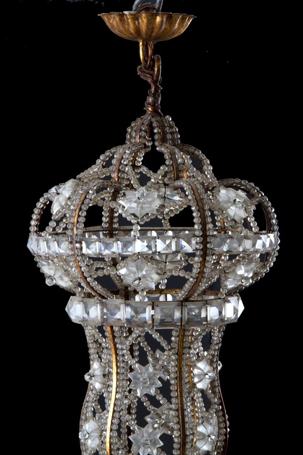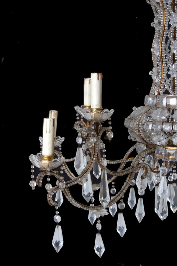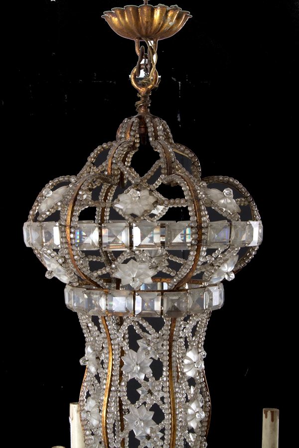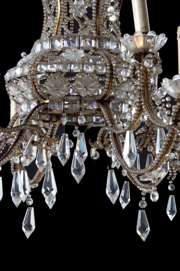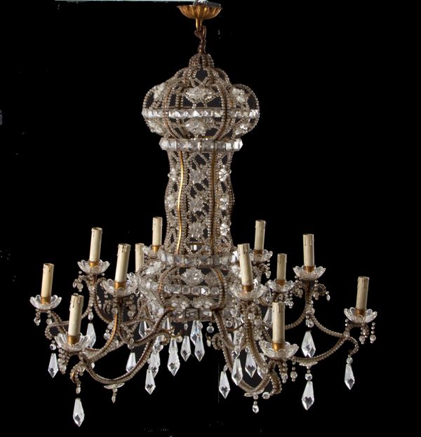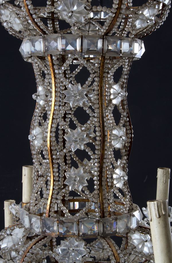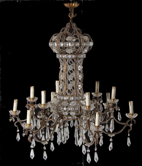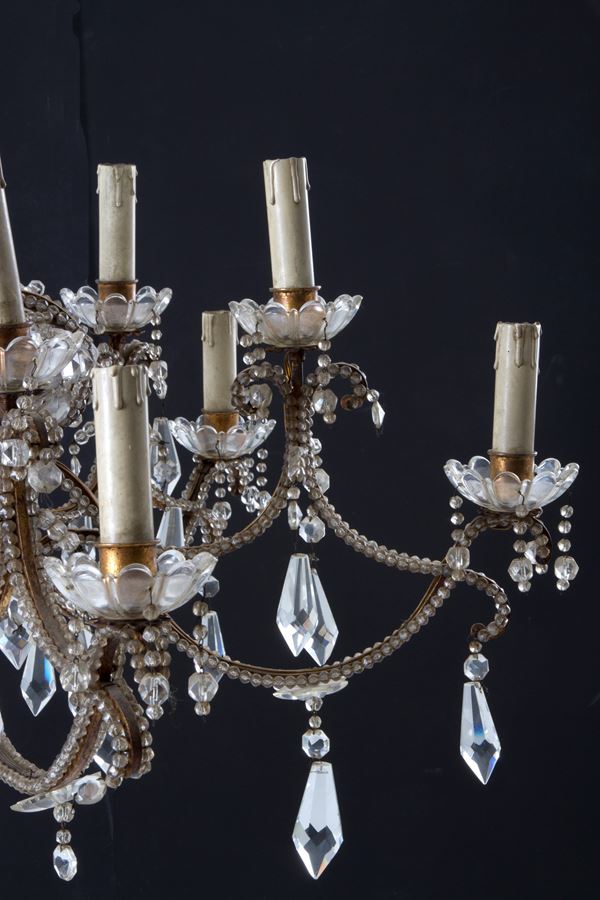 Coppia di lampadari dodici luci in ferro dorato con perline in vetro a motivi geometrici. Fine XIX secolo. Lievi difetti e mancanze.