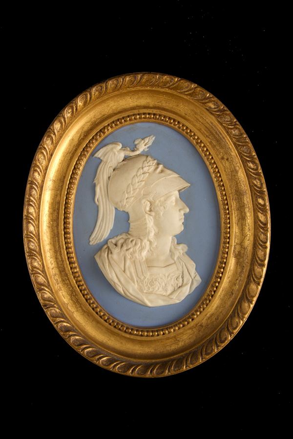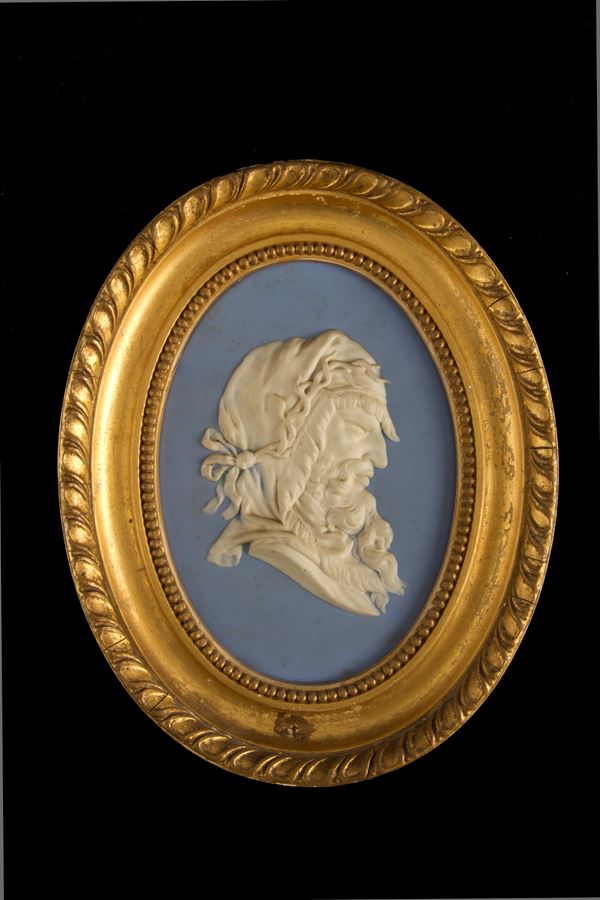 Coppia di placchette in biscuit raffiguranti  "PROFILO DI SOLDATO E LETTERATO". Manifattura WEDGWOOD. Fine XIX-inizi XX secolo. In cornice intagliate e dorate.