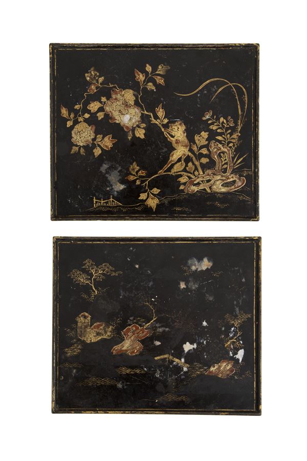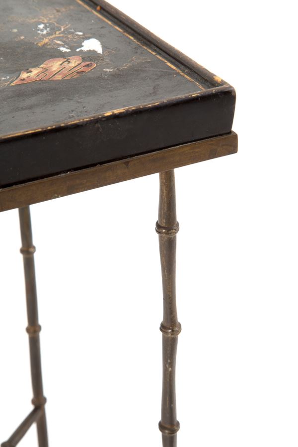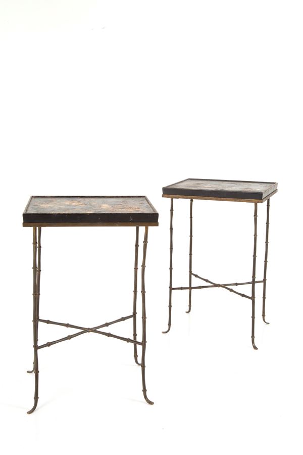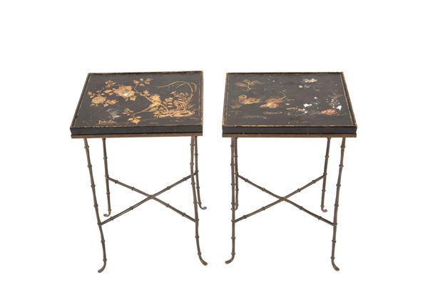 Coppia di tavolini in ferro patinato a finto bambù con piano in legno laccato a chinoiserie. Inizi XX secolo. Difetti.