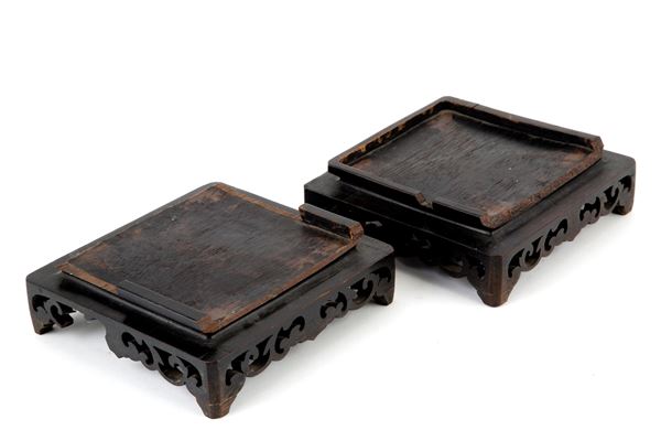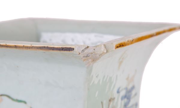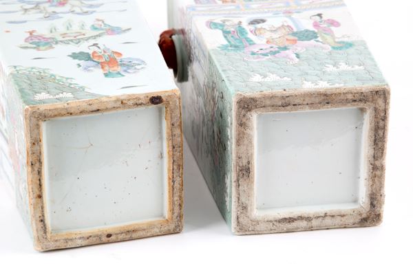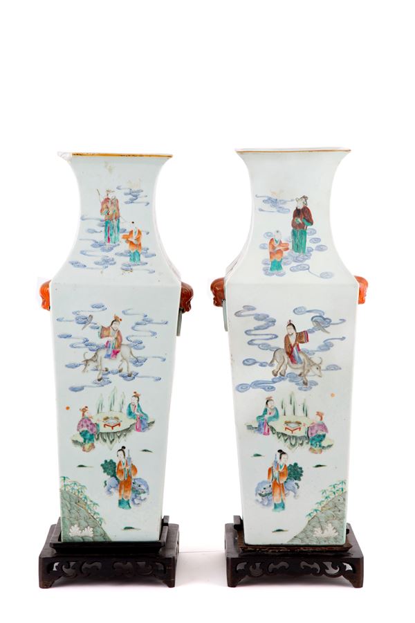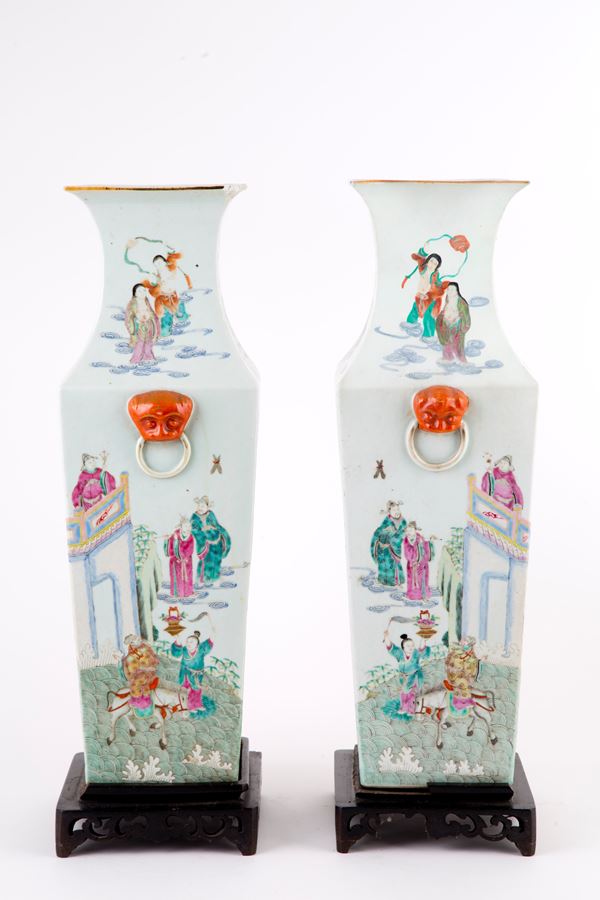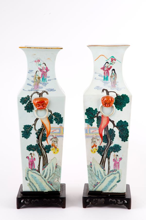 Coppia di vasi quadrilobati in porcellana Famiglia Rosa raffiguranti "SCENE DI VITA". Basi in legno. Cina. Difetti, mancanze e restauri.