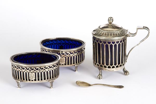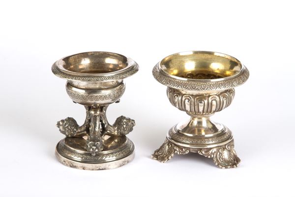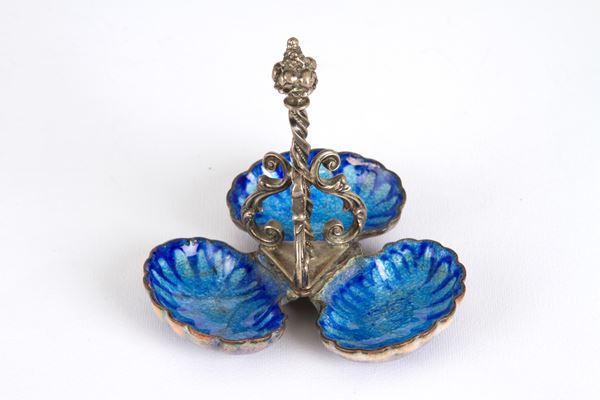 Dieci saliere di forme varie in argento smaltato, alcune con parti in vetro color blu cobalto, gr. 1000 ca. complessivi. Difetti. Misure varie.
