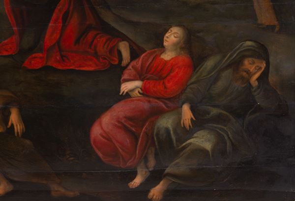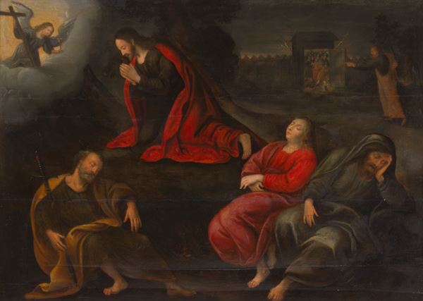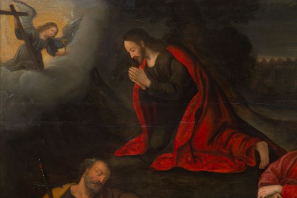 Dipinto olio su tavola impalchettata raffigurante "GESU' NELL'ORTO DEGLI ULIVI". Fine XVI-inizi XVII secolo. In cornice. Restauri.