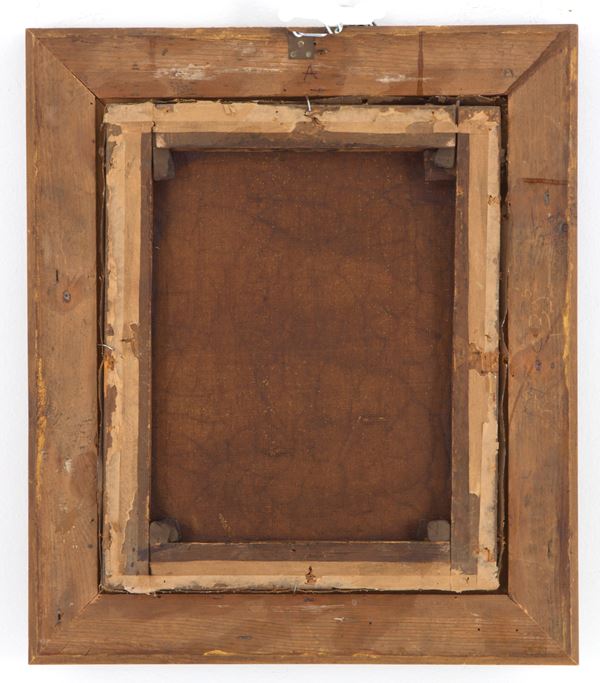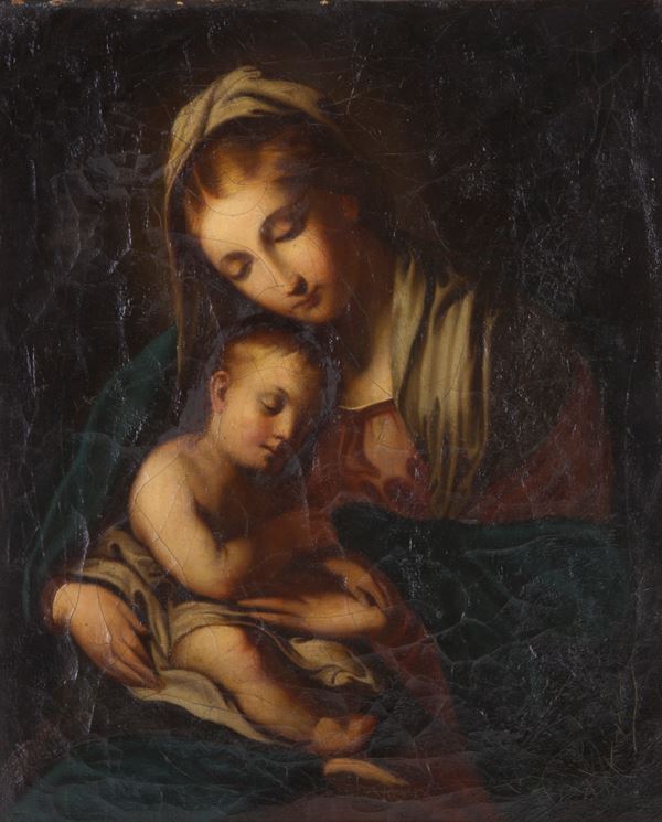 Dipinto olio su tela raffigurante "MADONNA CON BAMBINO". Inizi XVIII secolo. In cornice dorata. Difetti.